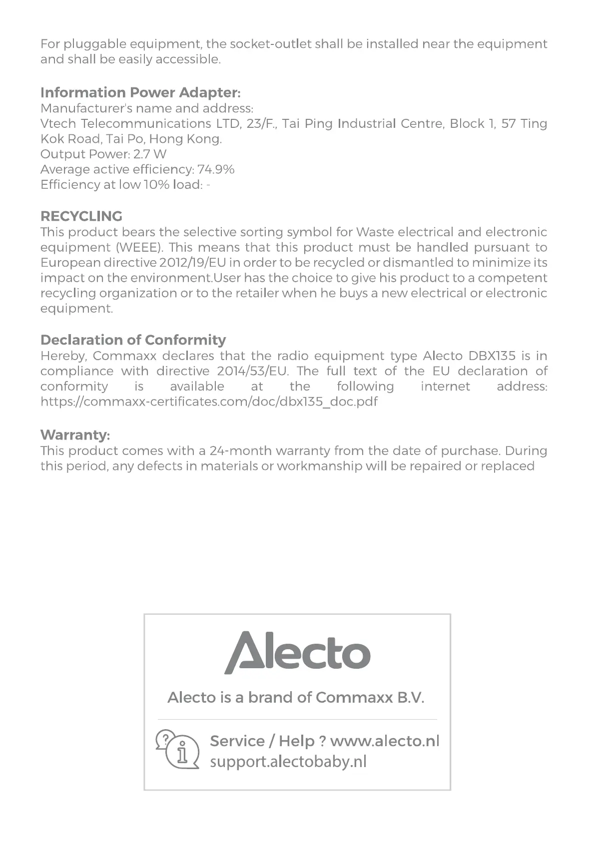 Bekijk gratis de handleiding van Alecto DBX135, stel vragen en lees de antwoorden op veelvoorkomende problemen, of gebruik onze assistent om sneller informatie in de handleiding te vinden of uitleg te krijgen over specifieke functies.