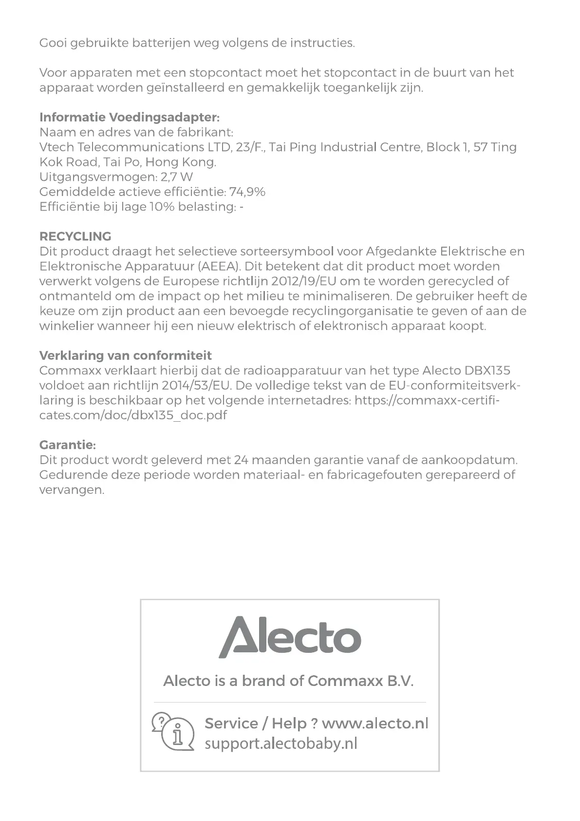 Bekijk gratis de handleiding van Alecto DBX135, stel vragen en lees de antwoorden op veelvoorkomende problemen, of gebruik onze assistent om sneller informatie in de handleiding te vinden of uitleg te krijgen over specifieke functies.