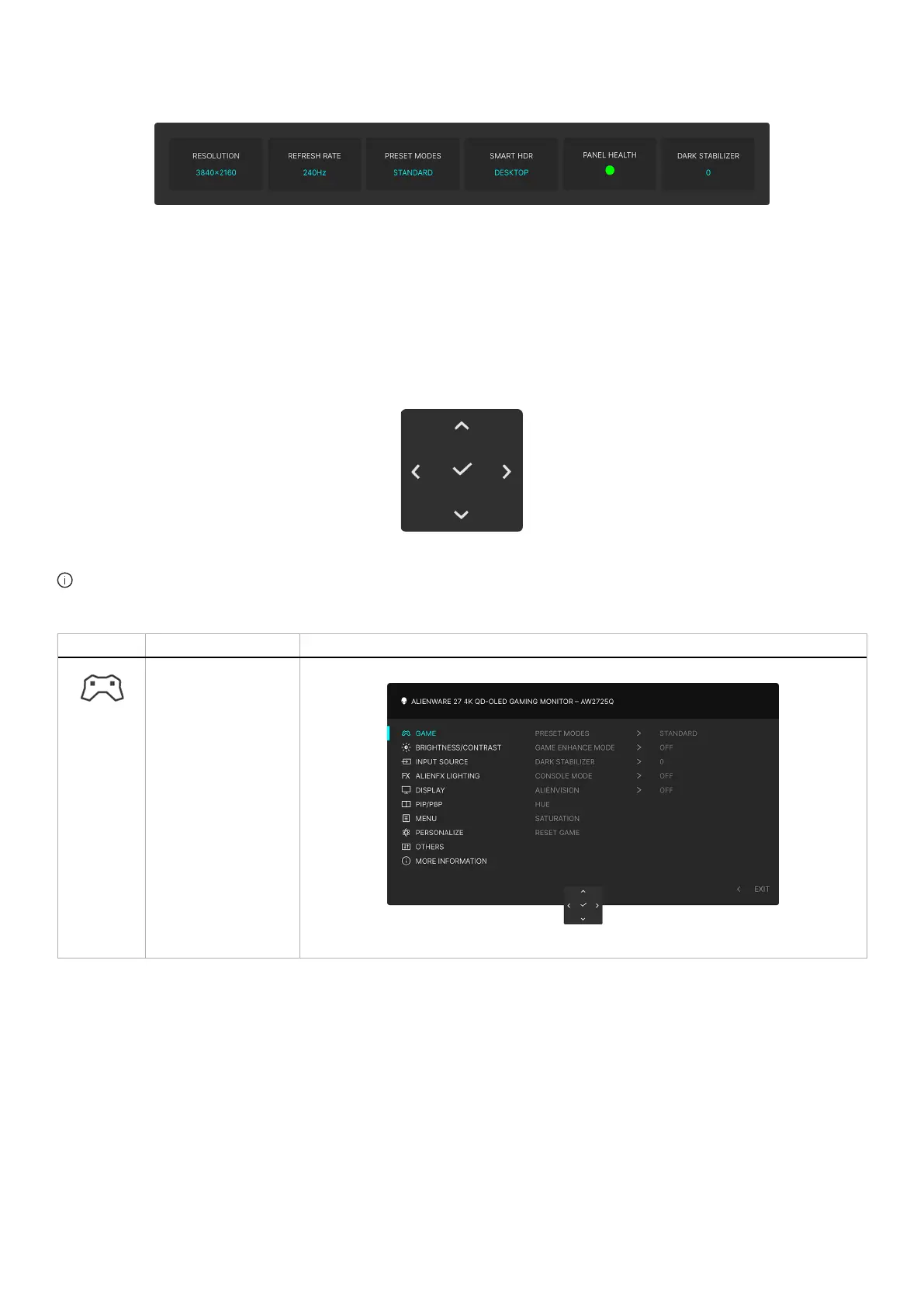 When the OSD menu is active, adjust the settings by moving the joystick button and follow the navigation keys at the bottom center