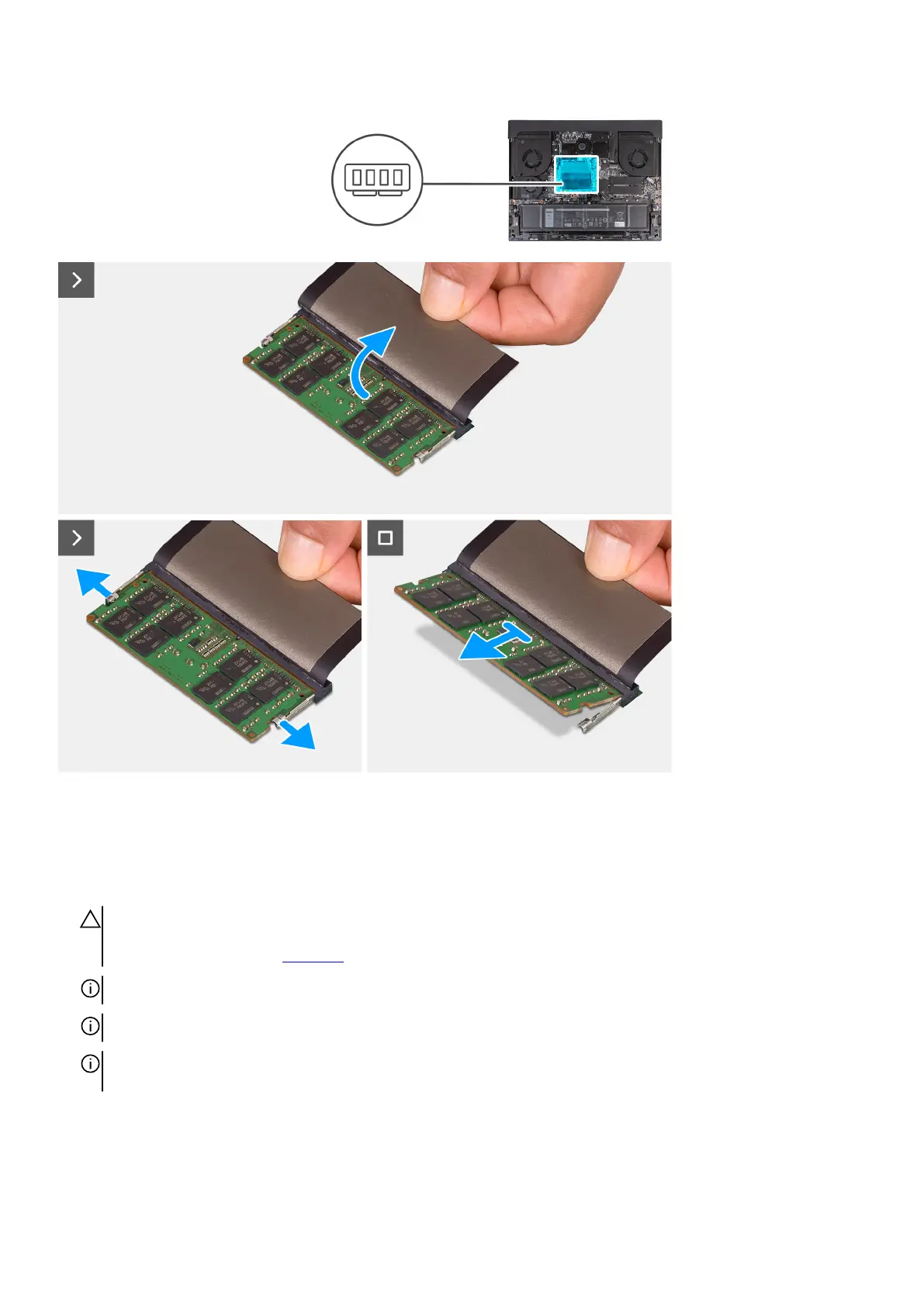 NOTE: If the memory module is difficult to remove, gently ease the memory module back and forth to remove it from the