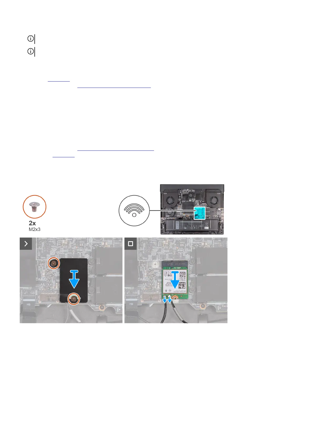 1. Remove the two screws (M2x3) that secures the wireless-card thermal shield to the wireless card and palm-rest and keyboard