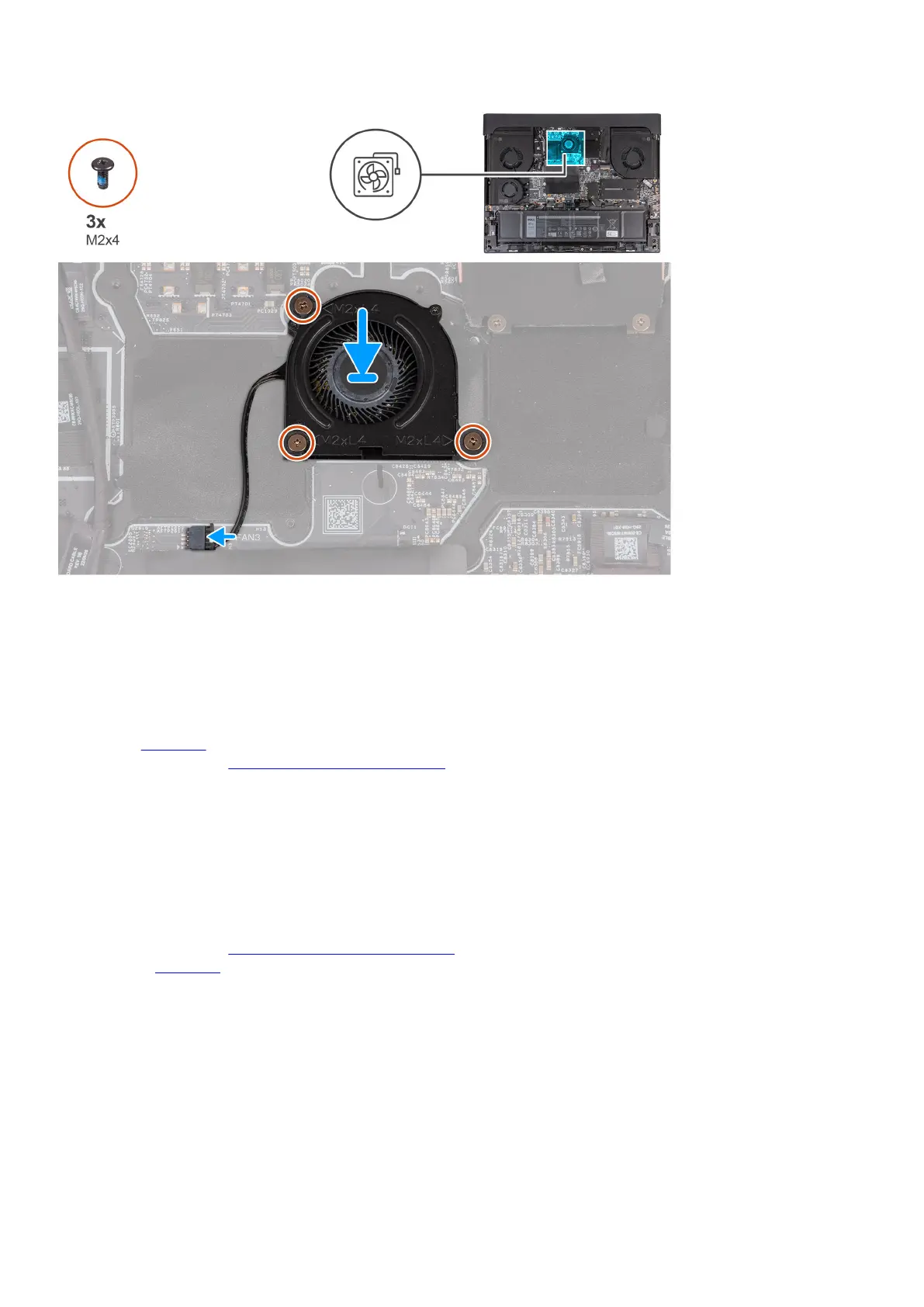 2. Replace the three screws (M2x4) that secure the fan to the palm-rest and keyboard assembly.