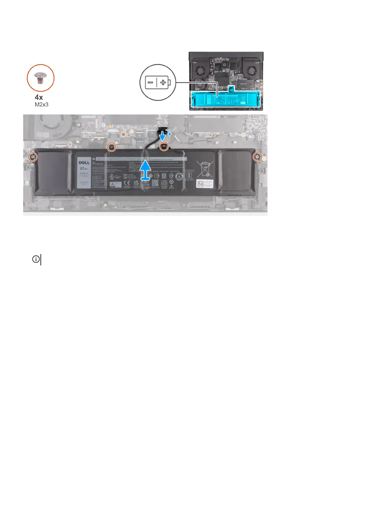 3. Remove the four screws (M2x3) that secure the battery to the palm-rest and keyboard assembly.