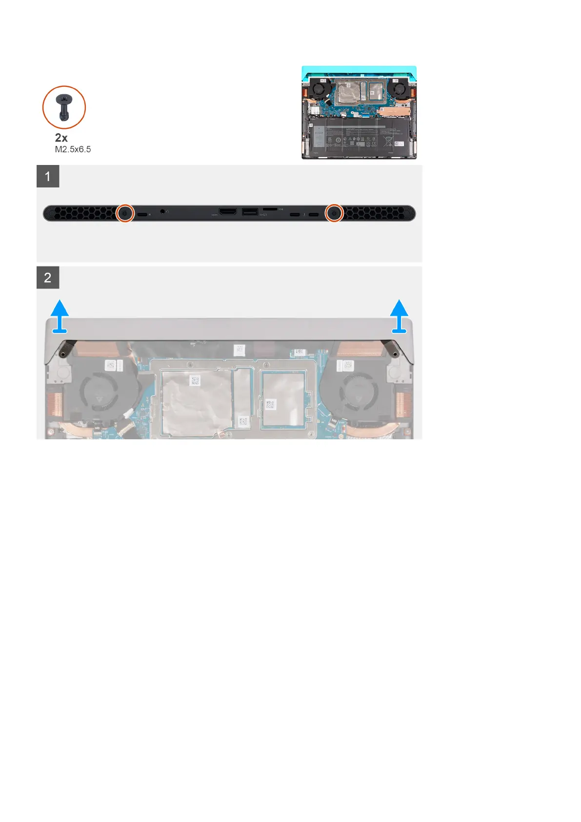 1. Verwijder de twee schroeven (M2.5x6.5) waarmee de achterste I/O-afdekplaat aan de palmsteun- en toetsenbordeenheid