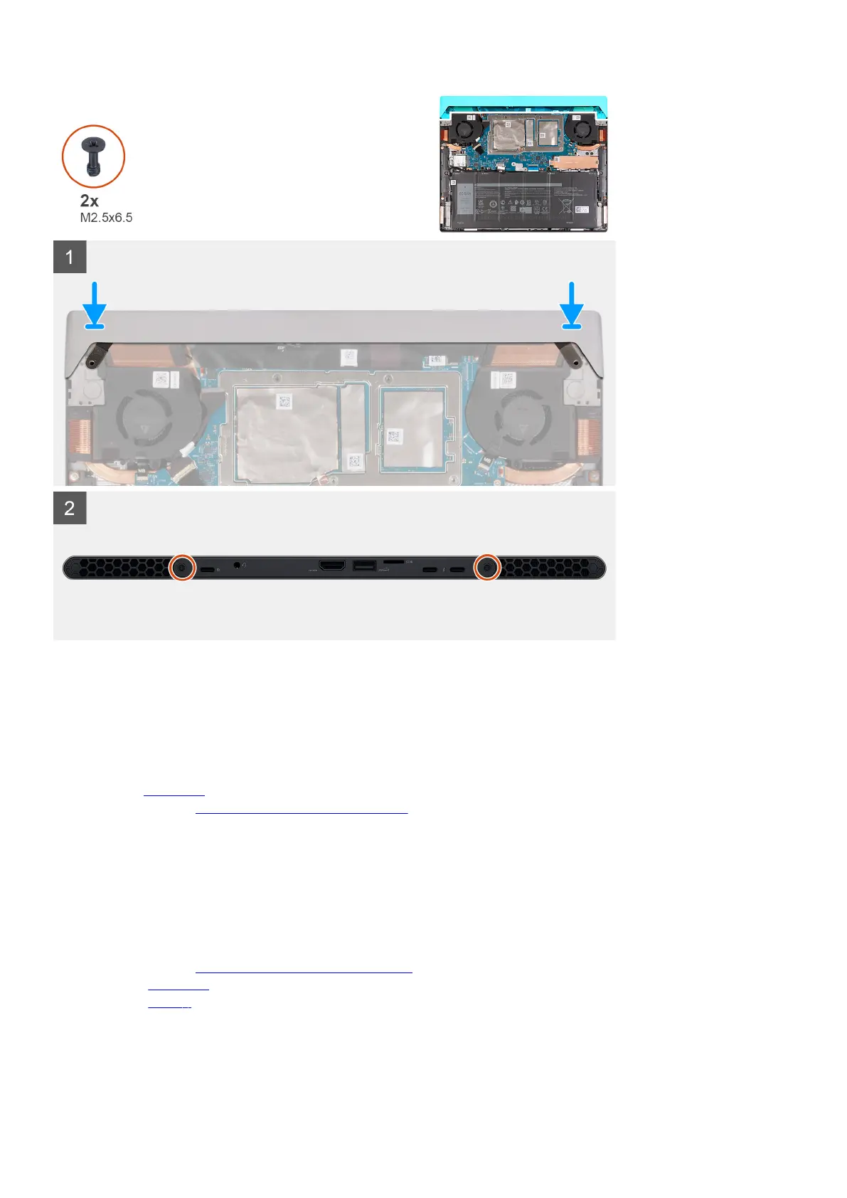 2. Plaats de twee schroeven (M2.5x6.5) terug waarmee de achterste I/O-afdekplaat aan de palmsteun- en toetsenbordeenheid