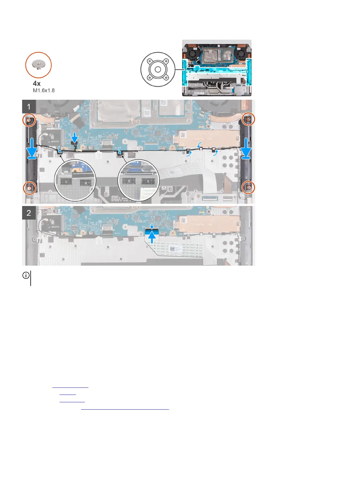 2. Plaats de vier schroeven (M1.6x1.8) terug waarmee de linker- en rechterluidspreker aan de palmsteun- en toetsenbordeenheid