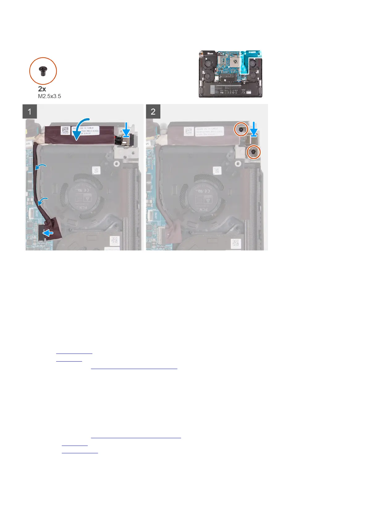 7. Replace the two screws (M2.5x3.5) that secure the power-adapter port bracket to the palm-rest and keyboard assembly.