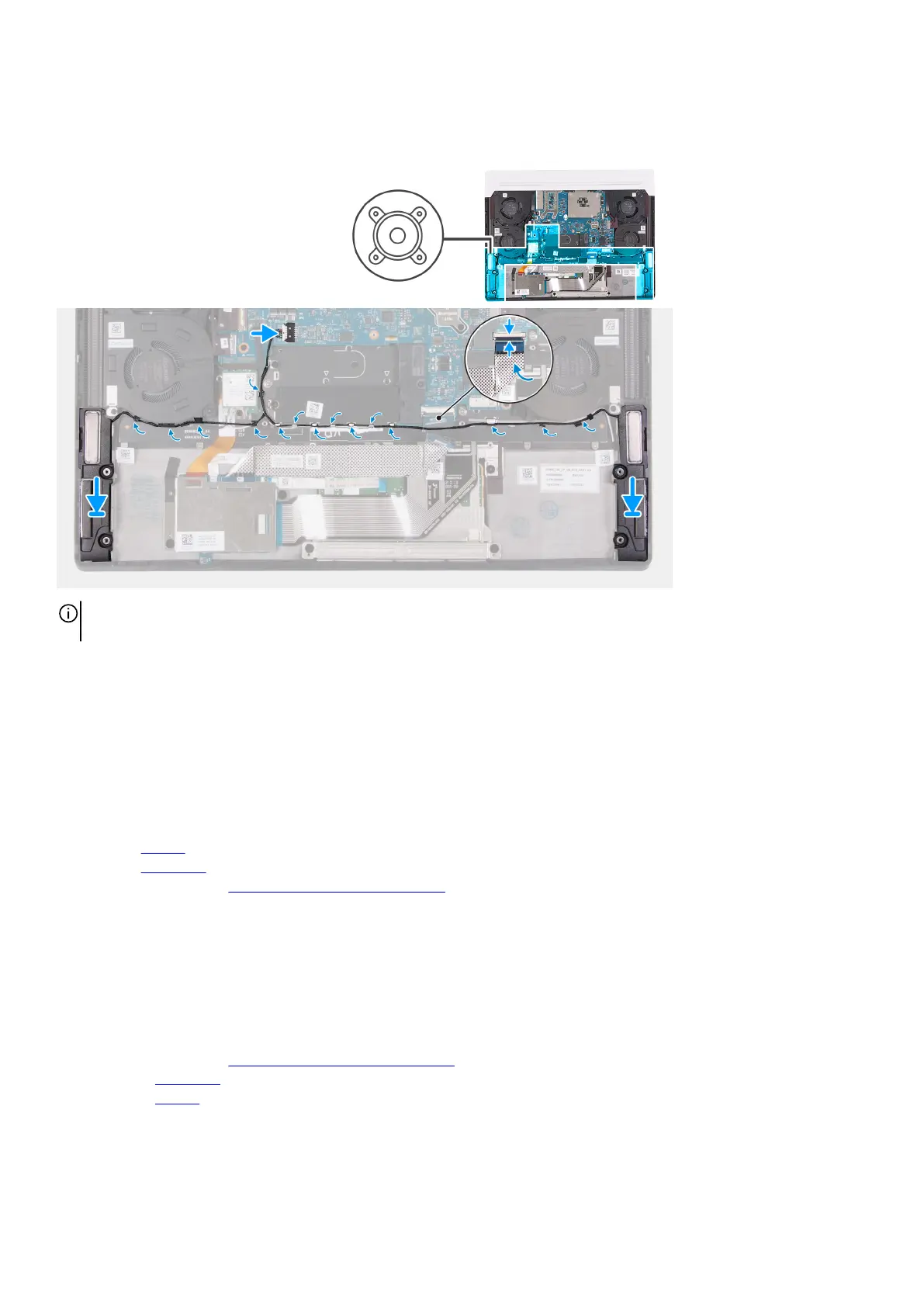2. Route the speaker cable through the routing guides on the palm-rest and keyboard assembly.