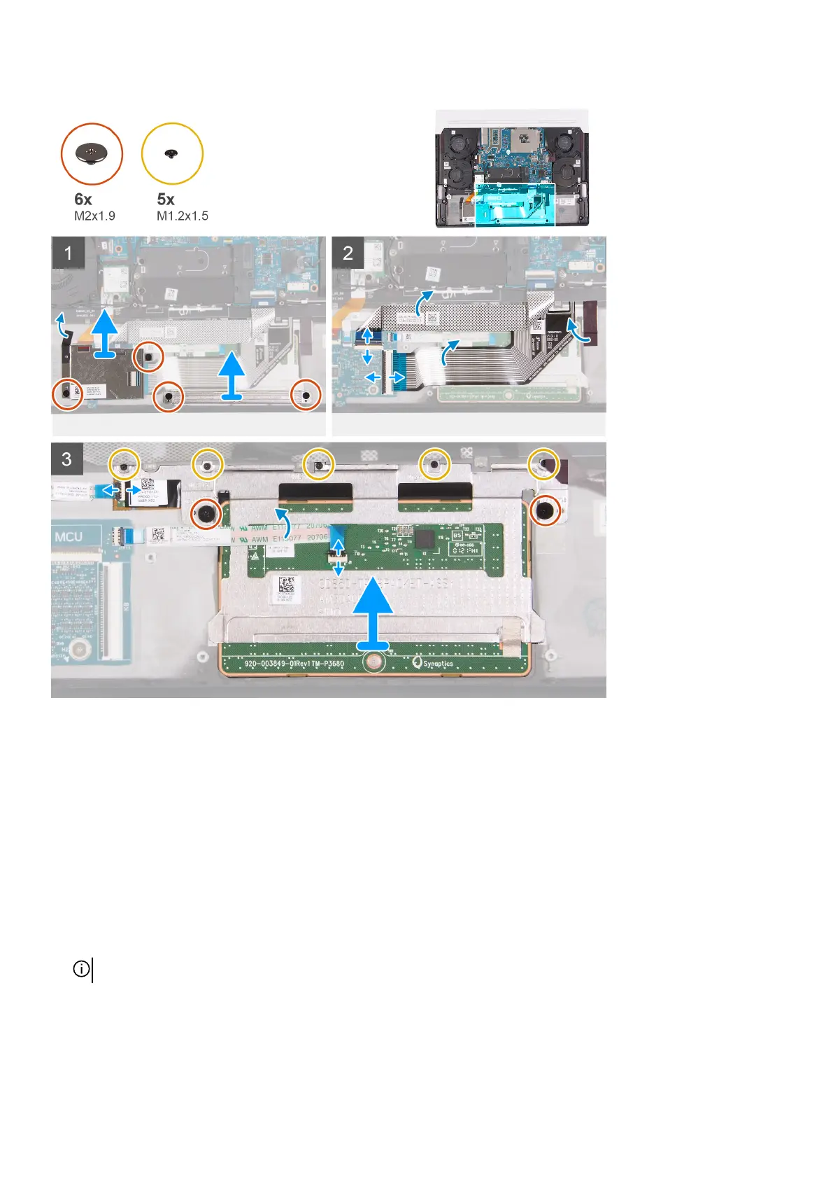 15.Remove the five screws (M1.2x1.5) that secure the touchpad to the palm-rest and keyboard assembly.