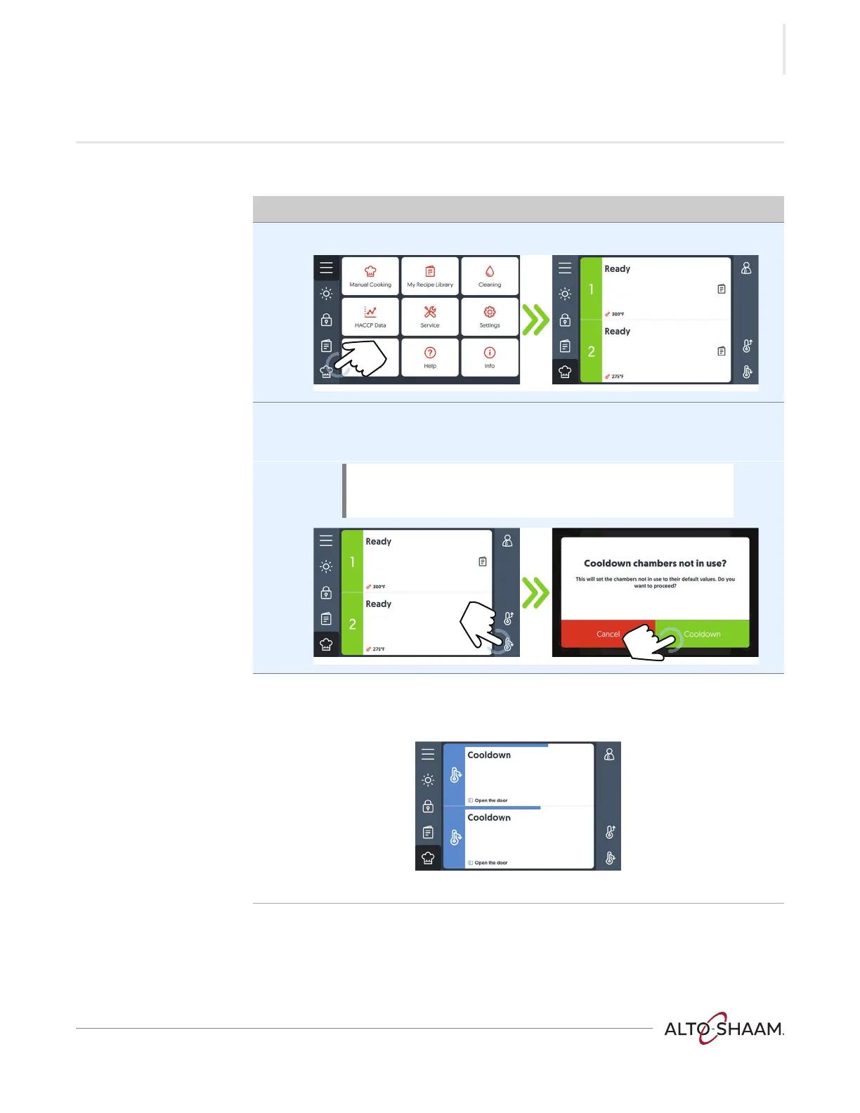 Touch “Cooldown” 1. Open the door.