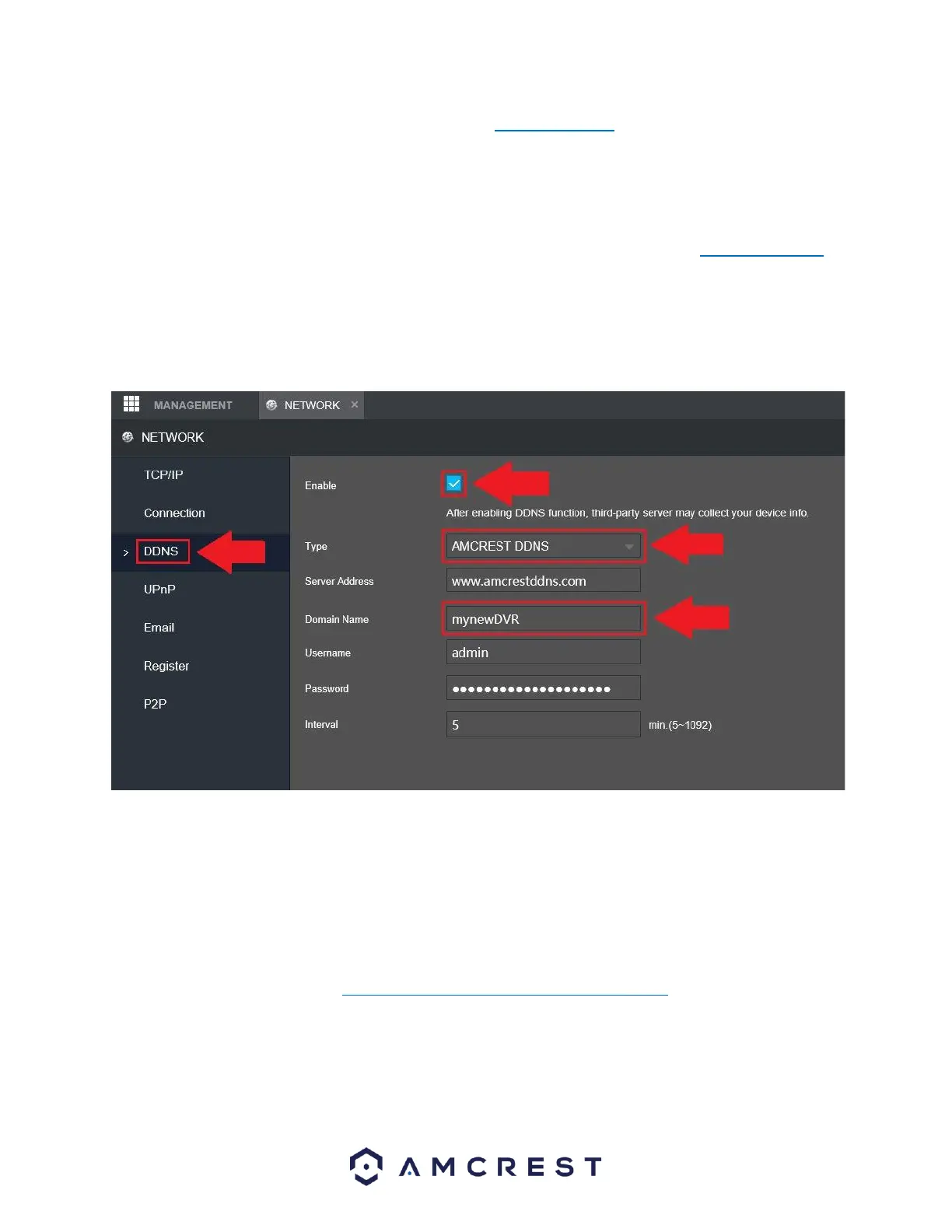 Enable checkbox to enable DDNS. Make sure the AMCREST DDNS type is selected and a domain name for