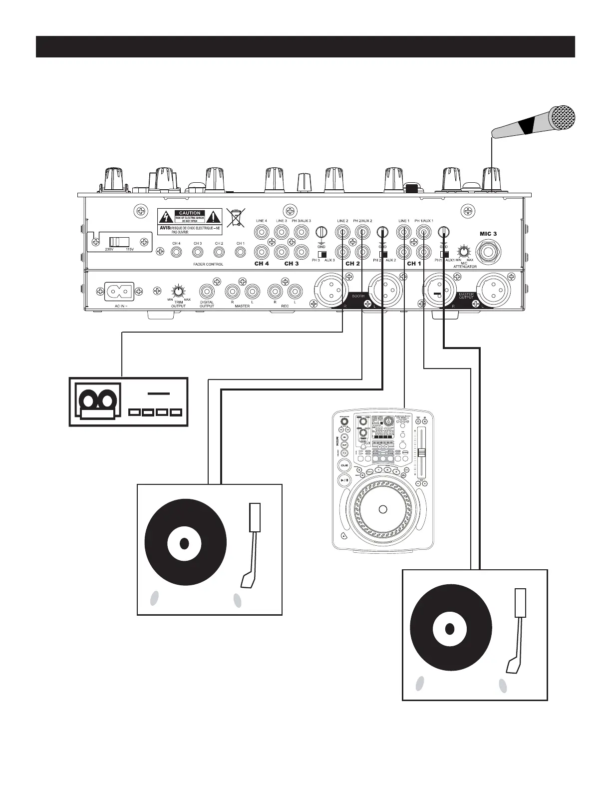 This image details a typical DJ Set Up consisting of a microphone, turn-