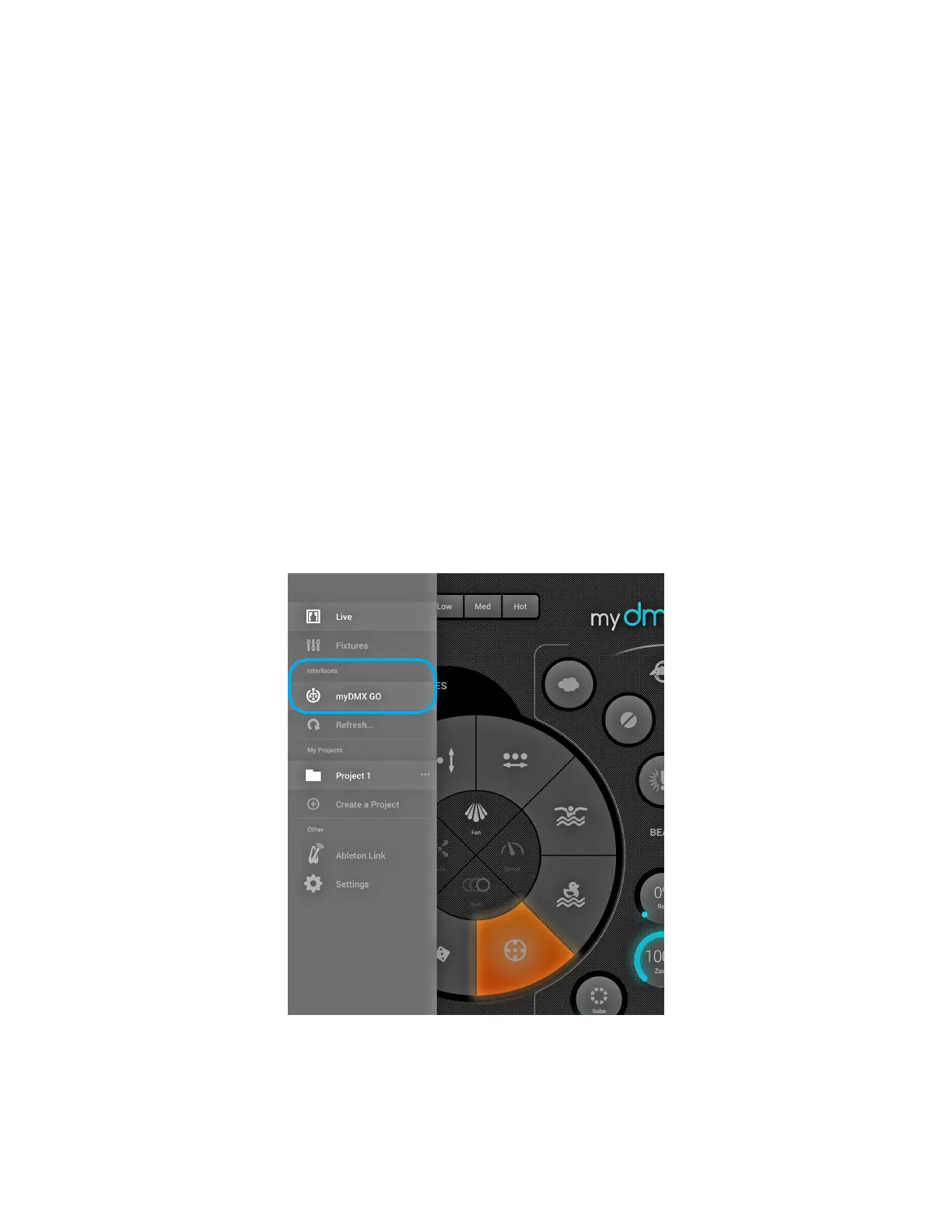 To begin, connect to the DMX device over WiFi, then start the myDMX GO App.