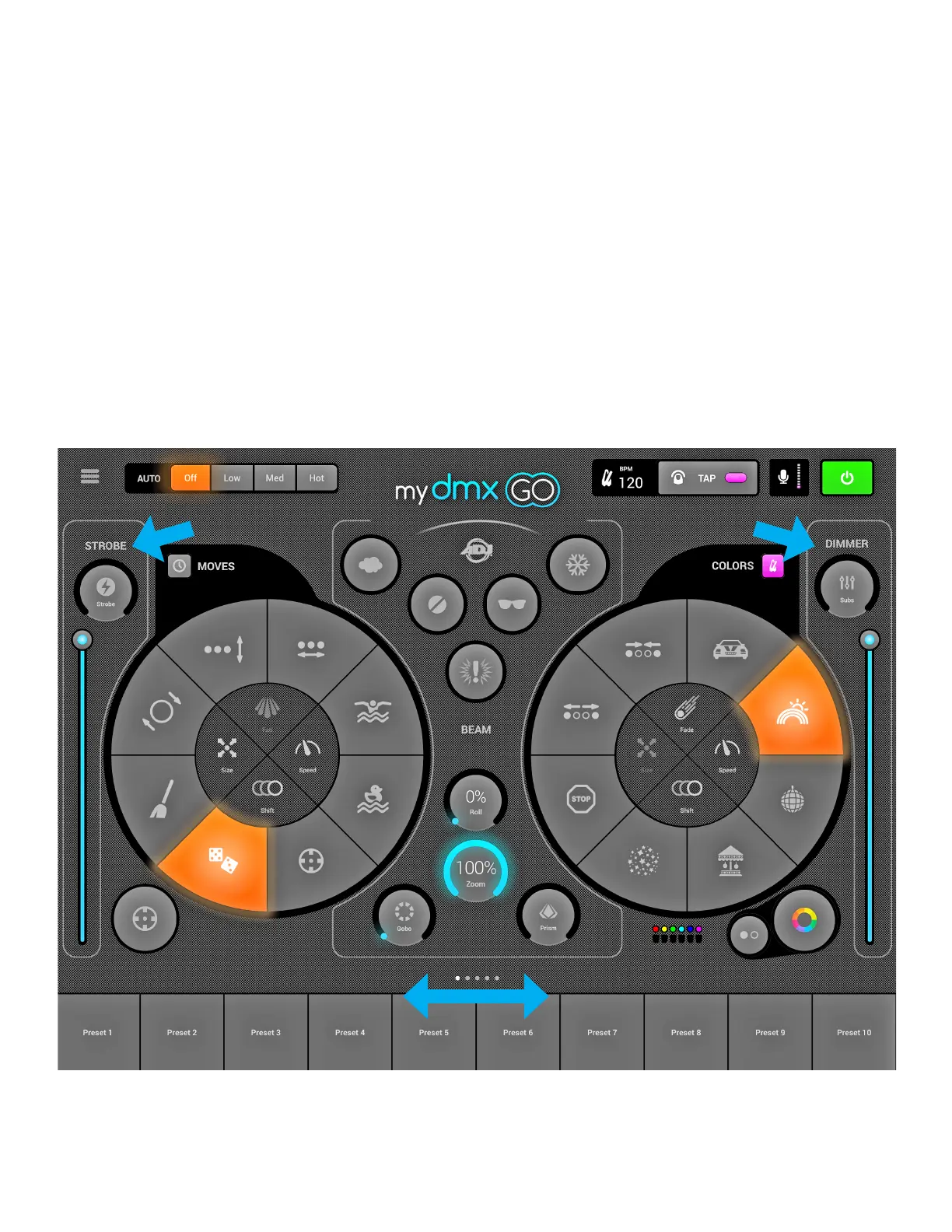 Tapping the strobe button will ash the lights at dierent speeds depending on the value of the slider.