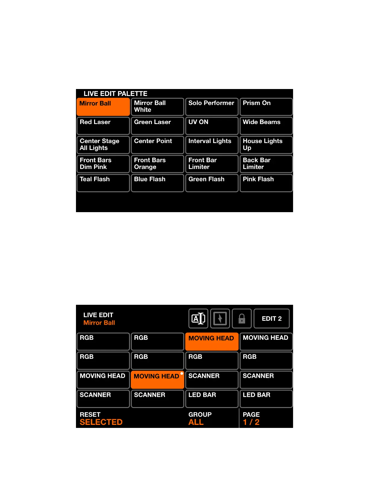 positions, colors, gobos, and other levels. The values on these screens are saved globally, therefore