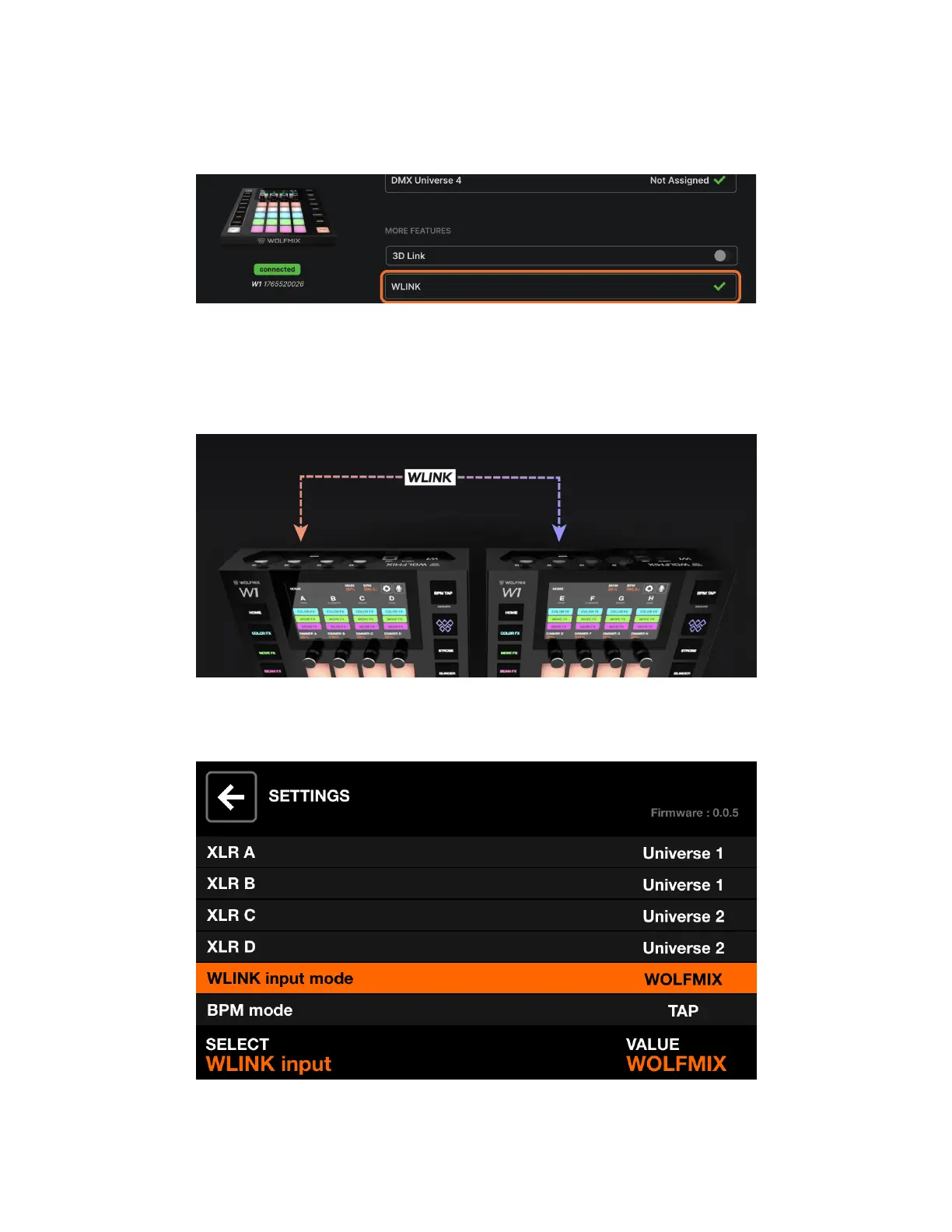 Once the WLINK add-on has been enabled, connect a 5pin Male - Male XLR cable to the WLINK socket