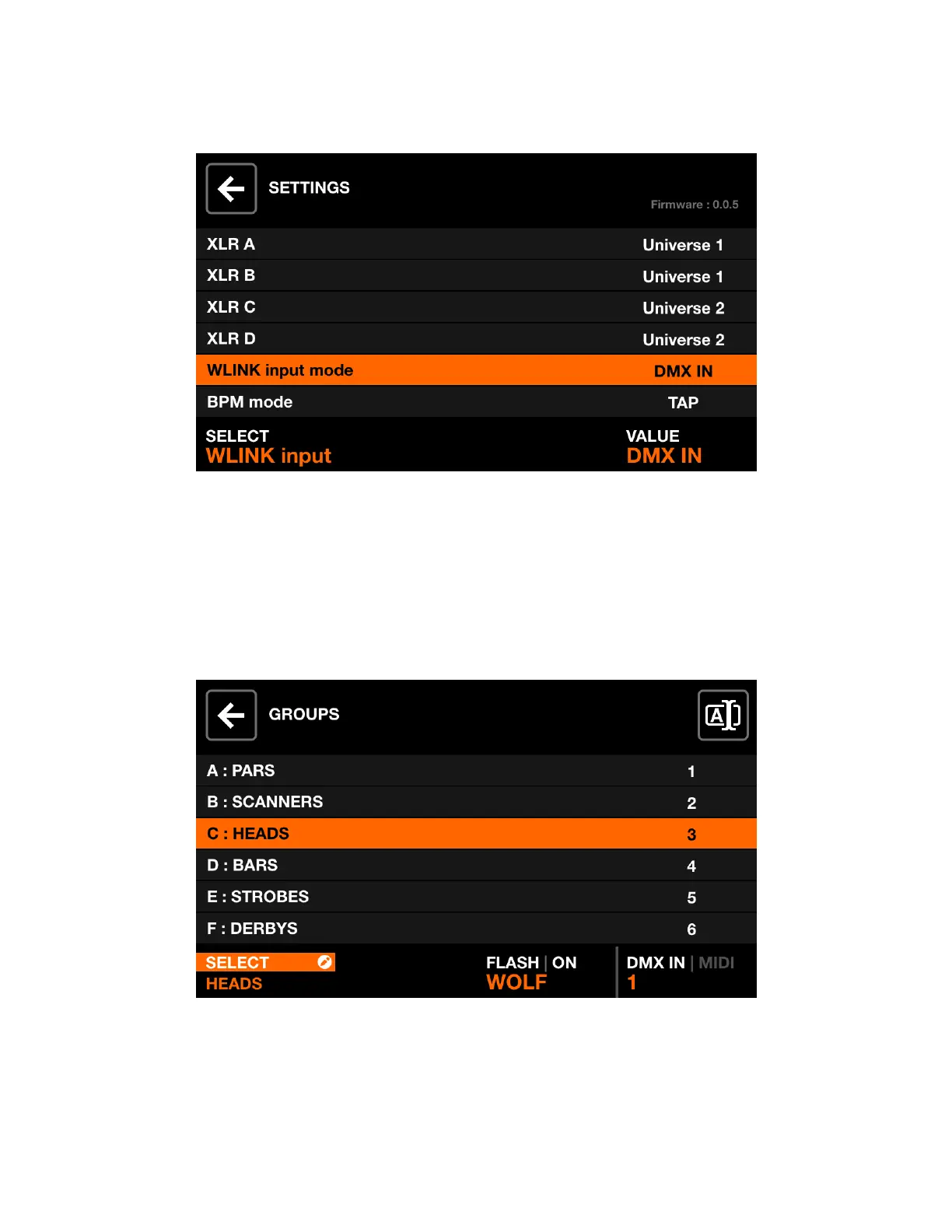 the Settings screen, scroll to WLINK input mode and select DMX IN.