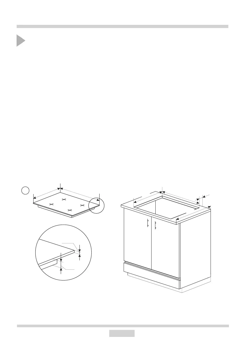 Die Önung in der Küchenplatte entsprechend den Abmessungen auf der Abb. 1 vorbereiten.