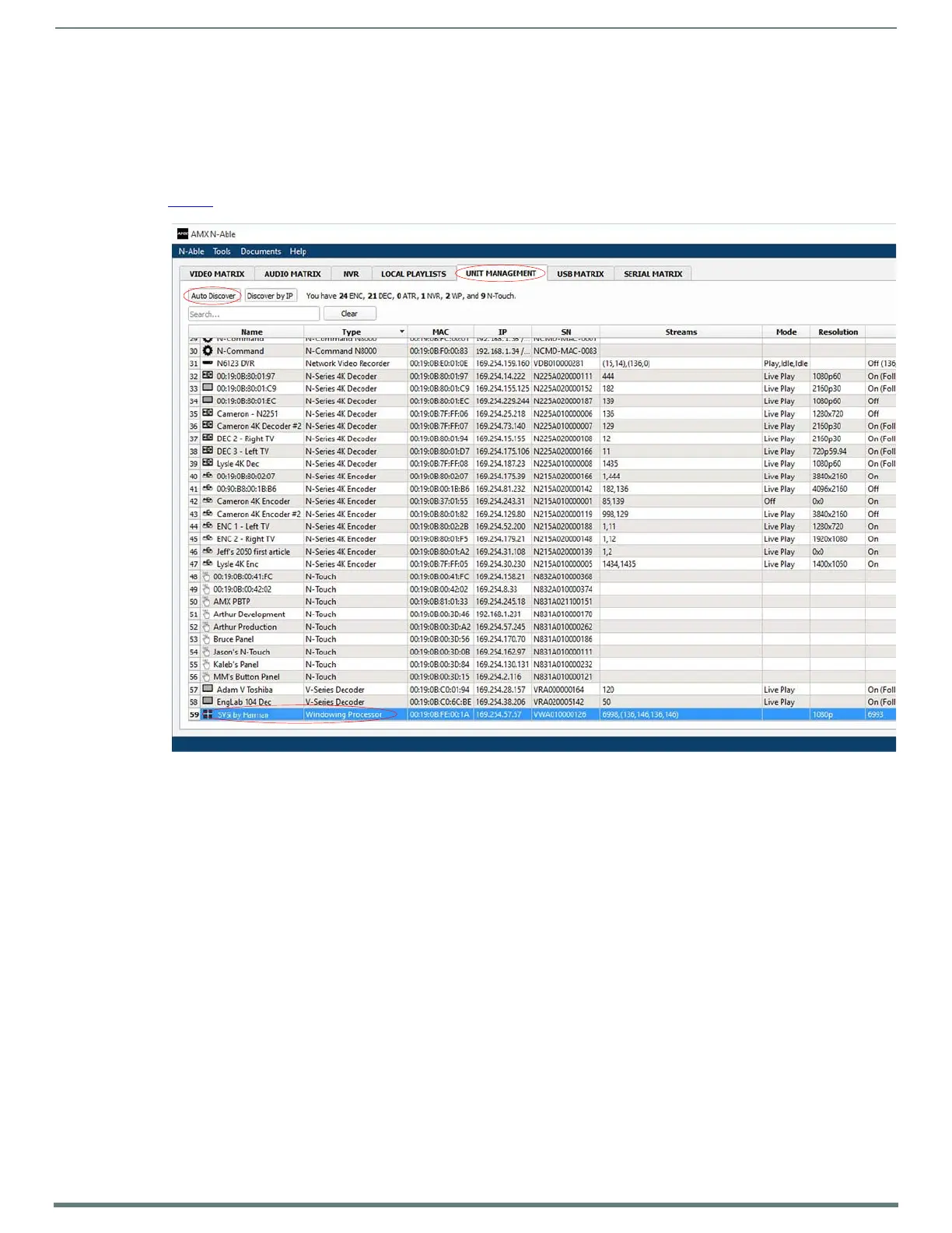 Once the host IP address is configured properly on the host computer, launch N-Able to view all discovered units. The N1512 units
