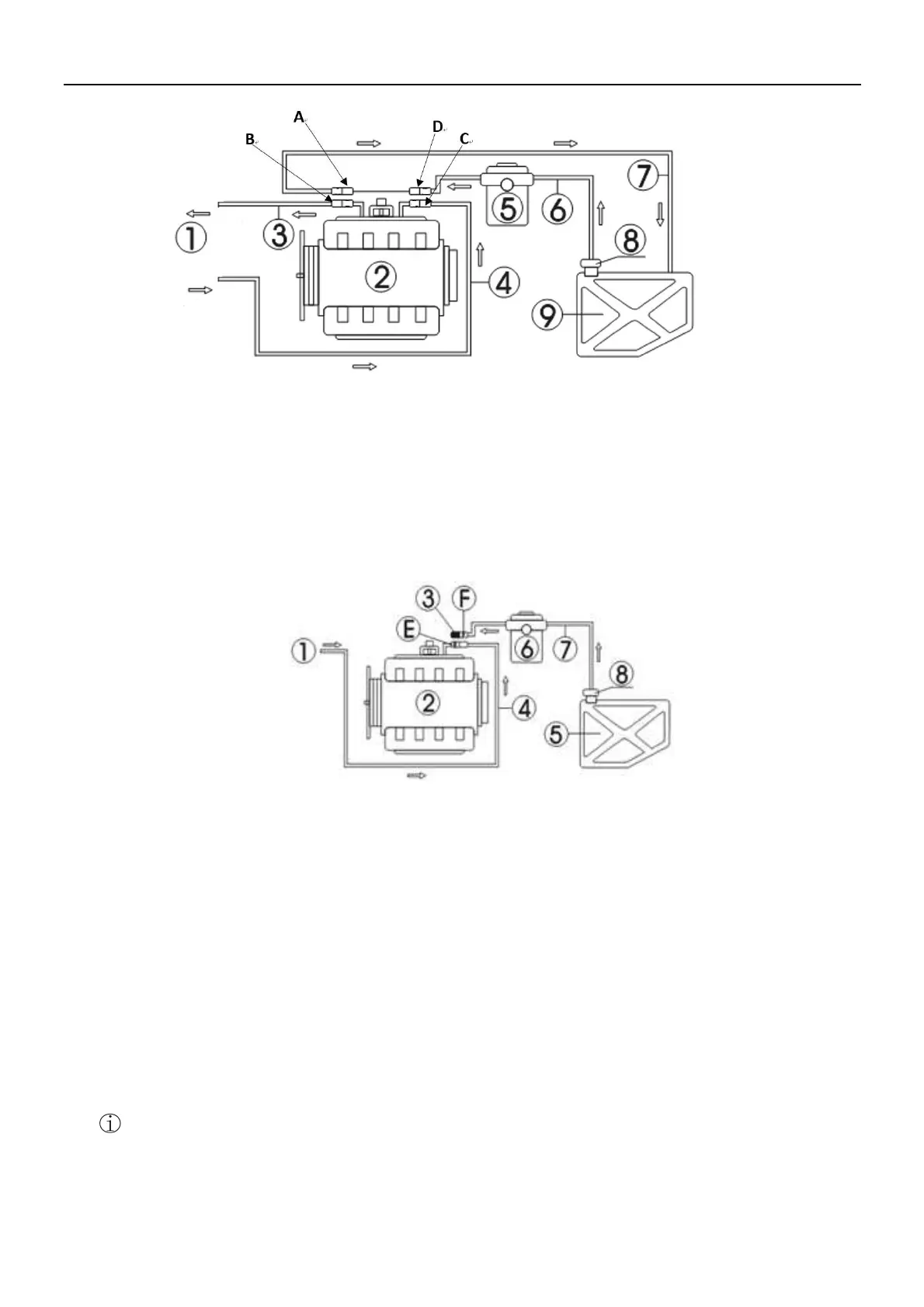 1) Disconnect the fuel supply hoses (E, F) of the engine fuel system (when disconnecting the fuel line connectors,