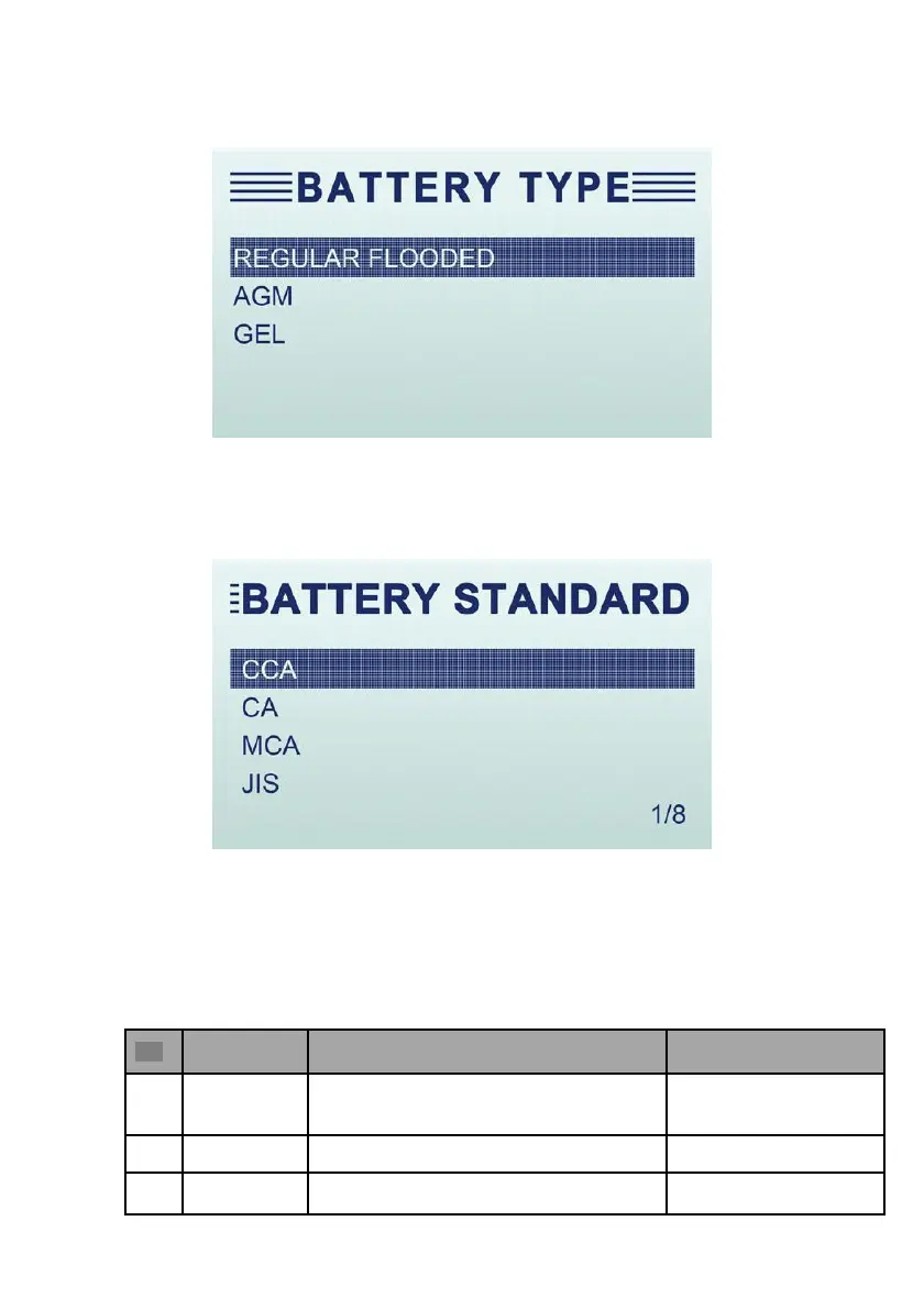 1.2.4 Scroll with the UP or DOWN button to select the battery standard from BATTERY