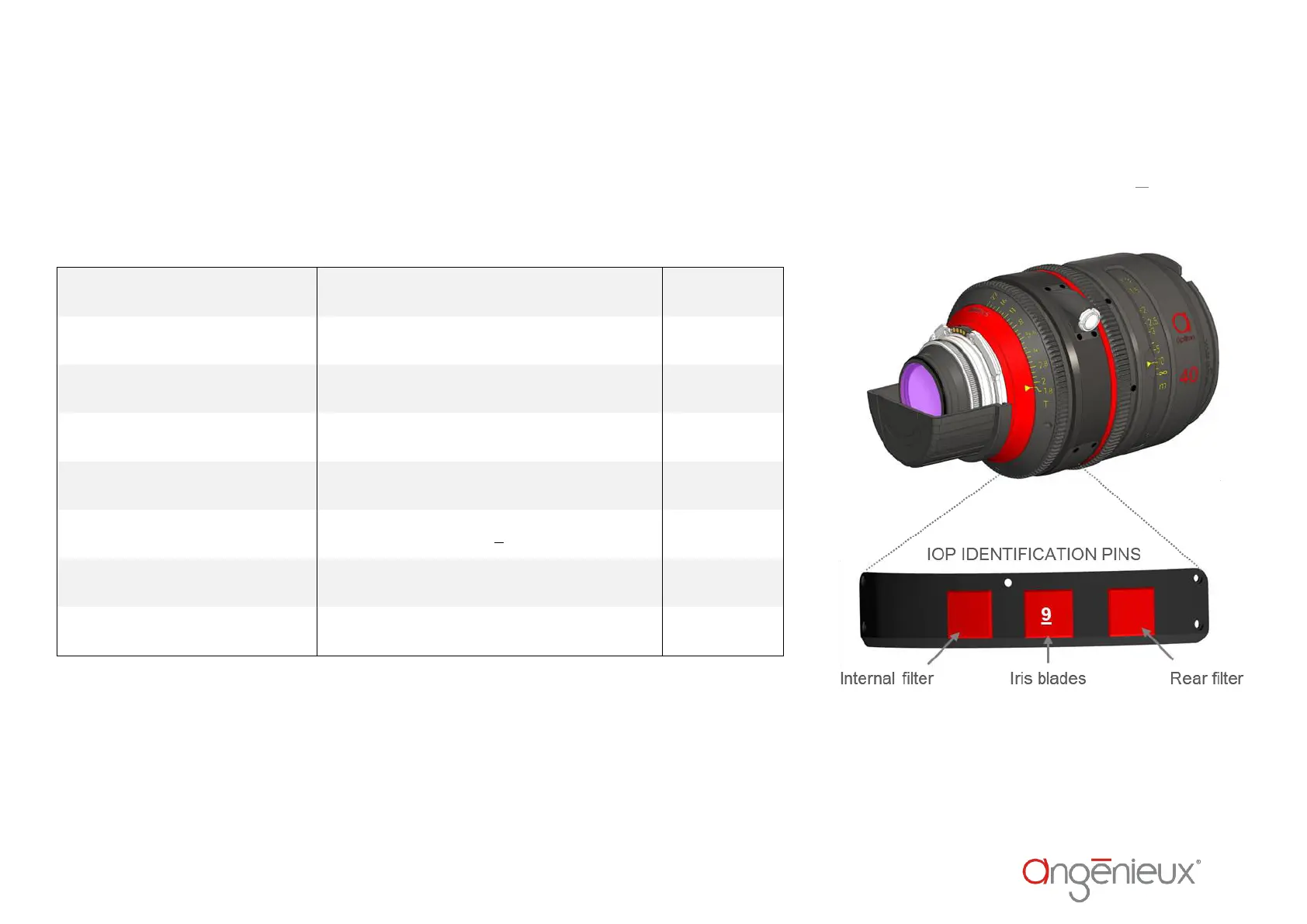 corresponds to the nine blades iris and standard internal and rear filters. Colors and label configuration is described in the table below.
