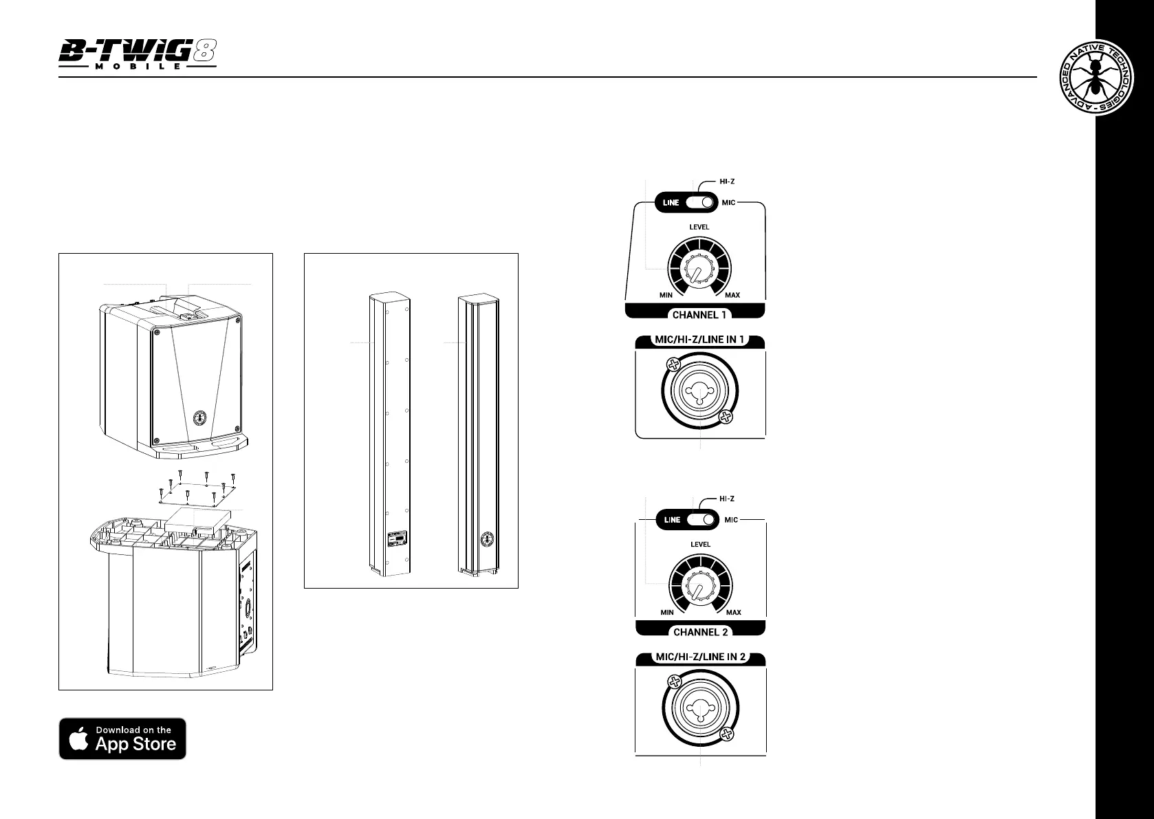 Le système se compose d’un subwoofer actif B-TWIG 8S MOBILE et du kit B-TWIG 8CS :
