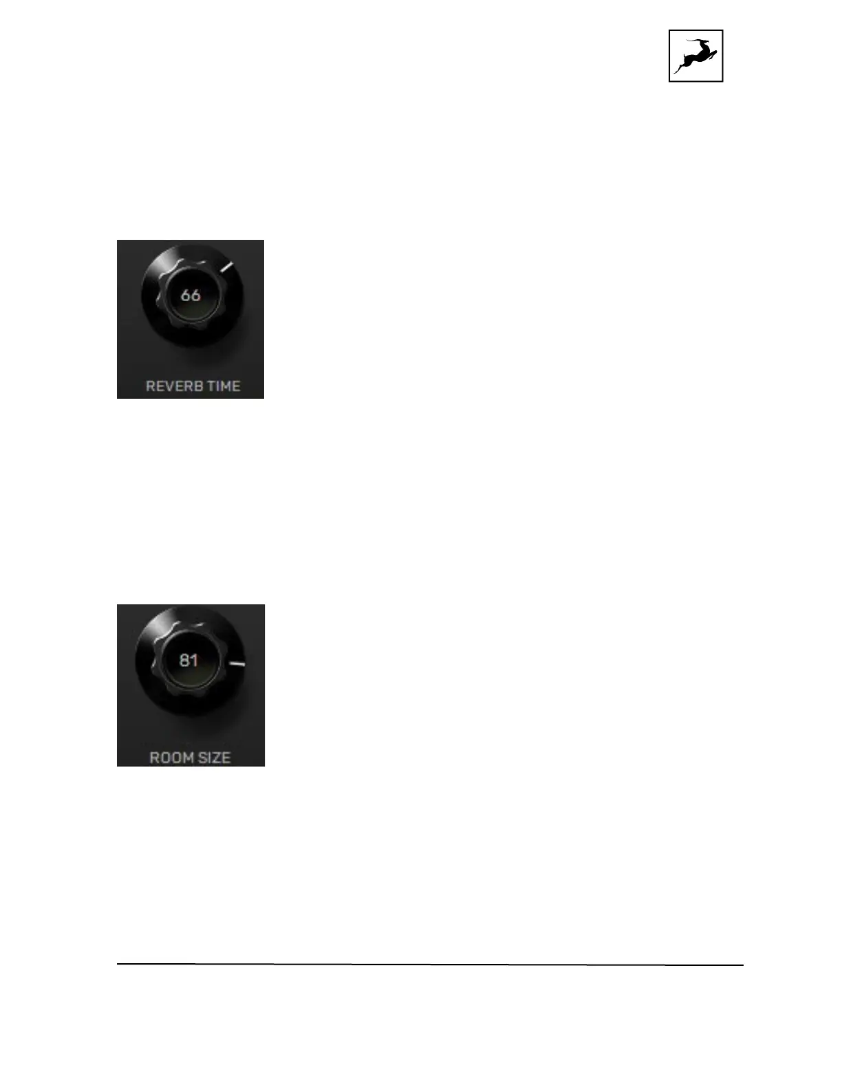 Reverb Time controls the length of decay, while Room Size increases the virtual space