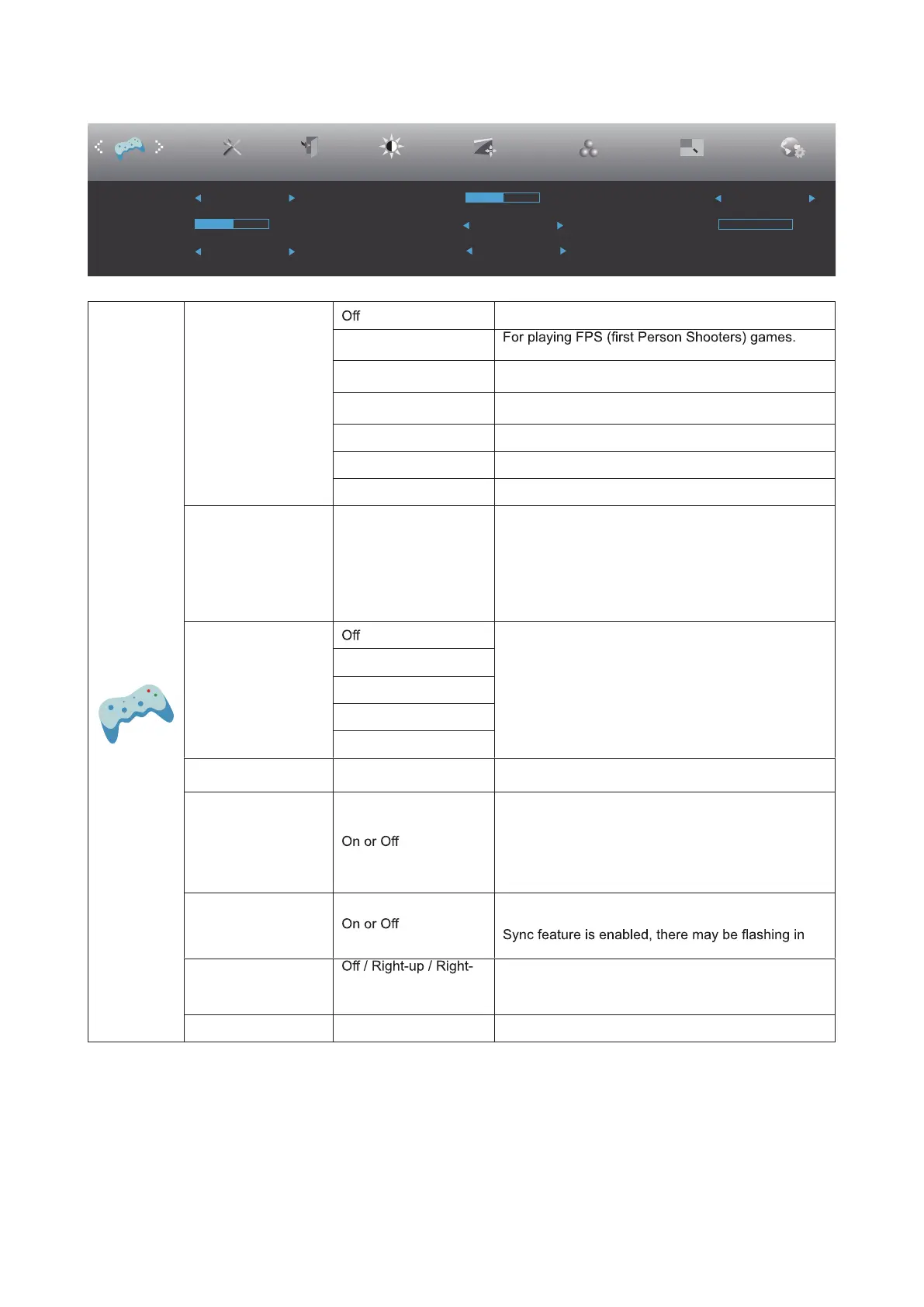 When “ Color Gamut ” under “ Color Setup ” is set to “ sRGB ”, the items “ Game Mode ”, “ Shadow Control ”, “ Game Color ”
