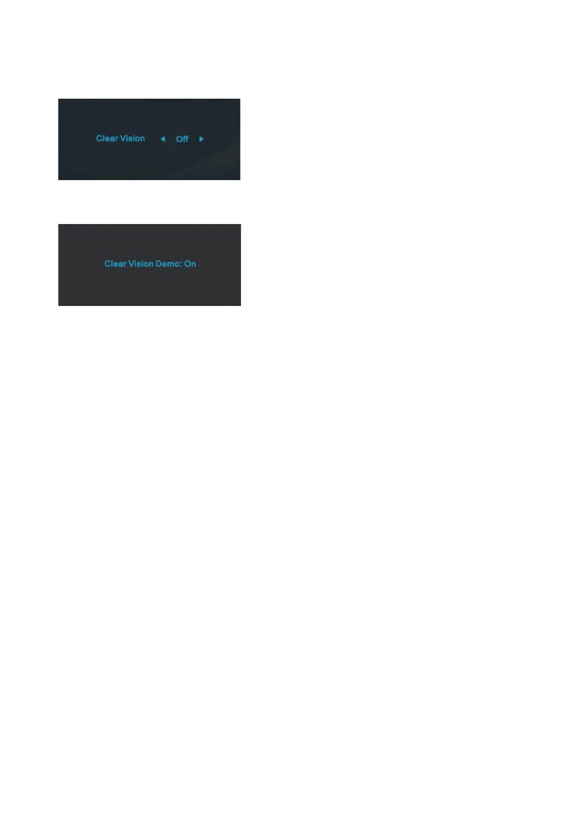 3. Press and hold “ <” button for 5 seconds to activate the Clear Vision Demo, and a message of “Clear Vision Demo: on”