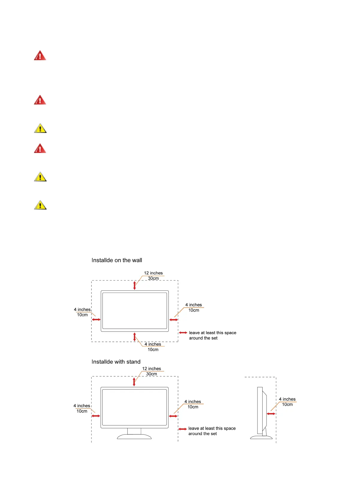 See below the recommended ventilation areas around the monitor when the monitor is installed on the wall or on the