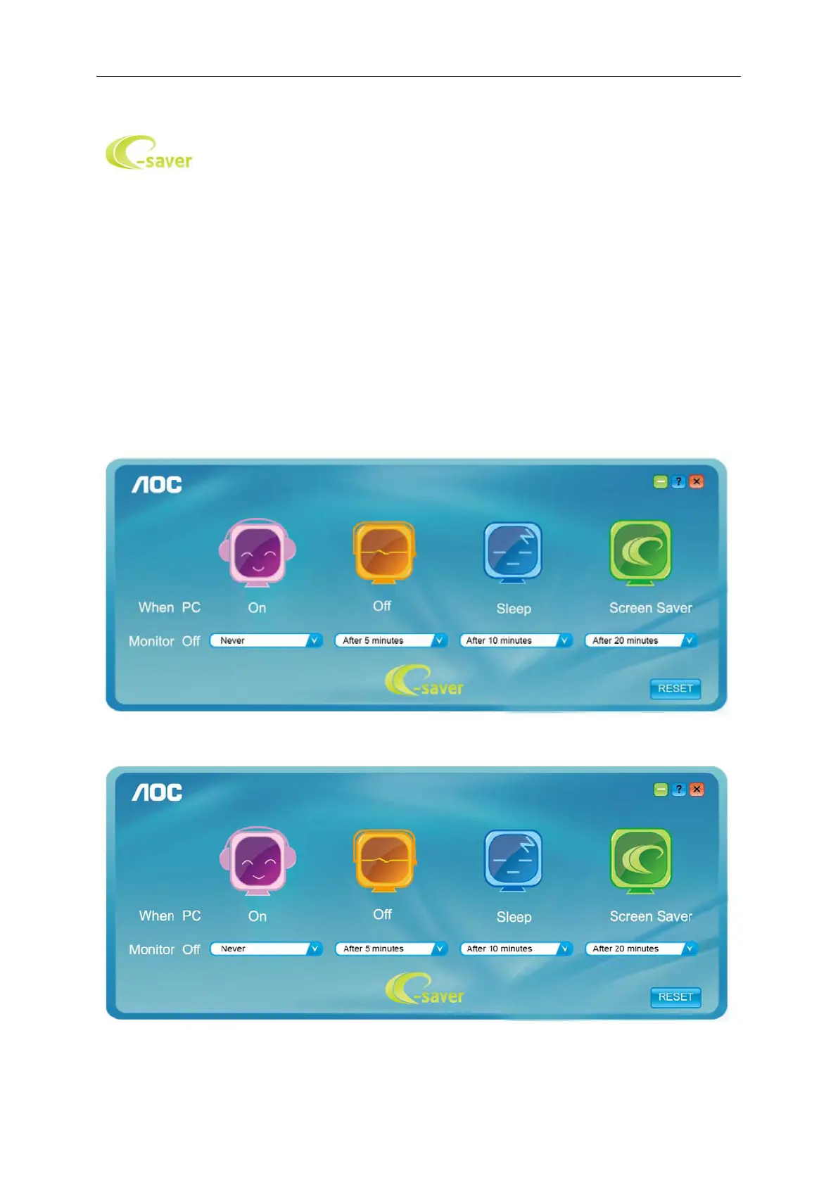 U kunt op "RESET" klikken om de standaardinstellingen van de e-Saver te herstellen zoals hieronder.