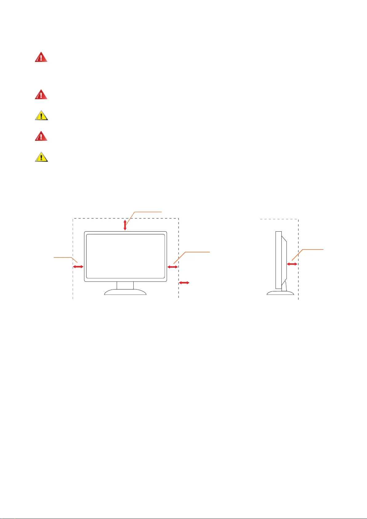 在显示器四周留出如下所示的空间。另外,空气循环可能不充分,由此过热可以引起火灾或者对显示器的破坏。