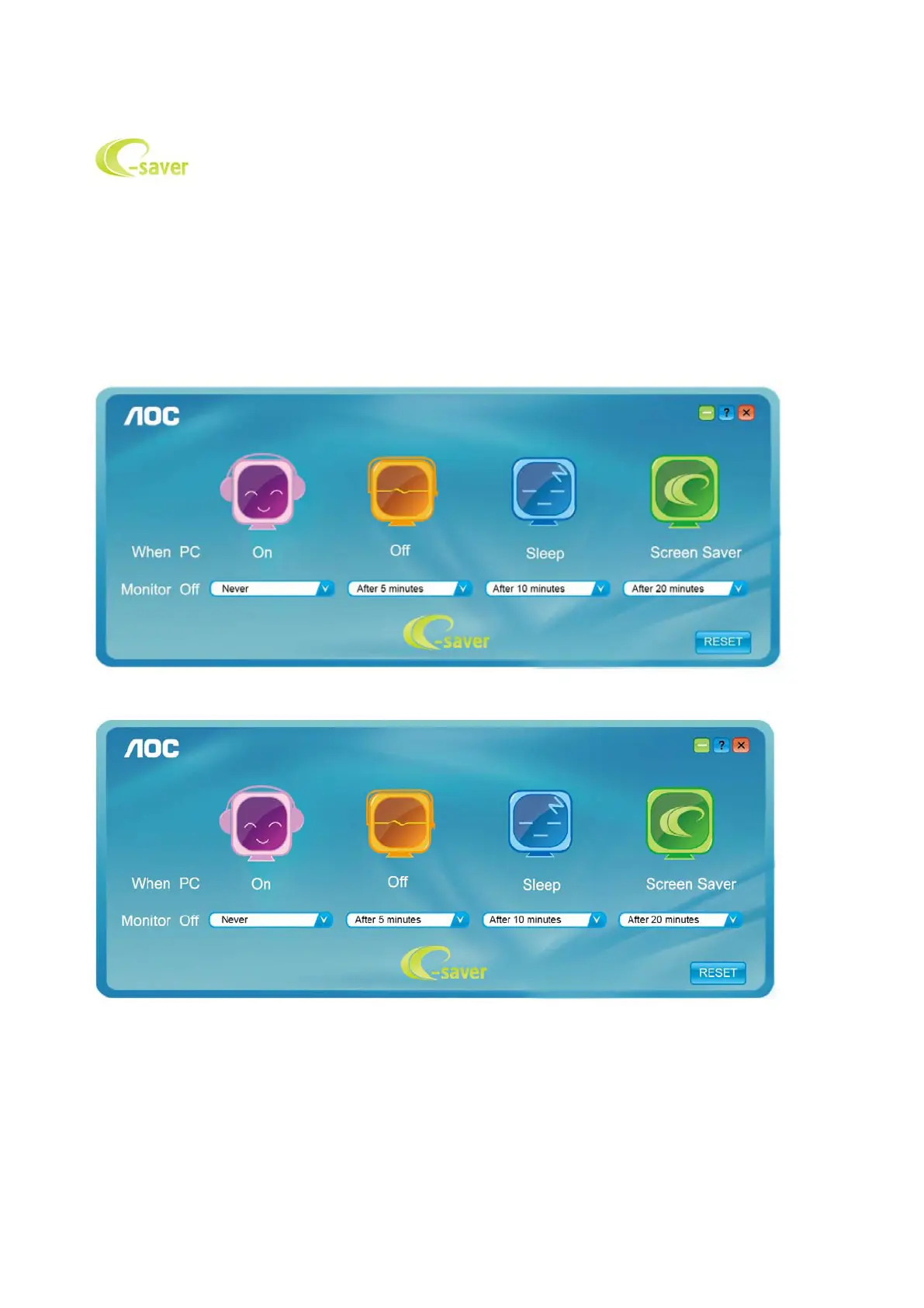 歡迎使用 AOC e-Saver 顯示器電源管理軟體! AOC e-Saver 具備「智慧關機」功能,讓顯示器在任何電腦狀態下(開啟、關