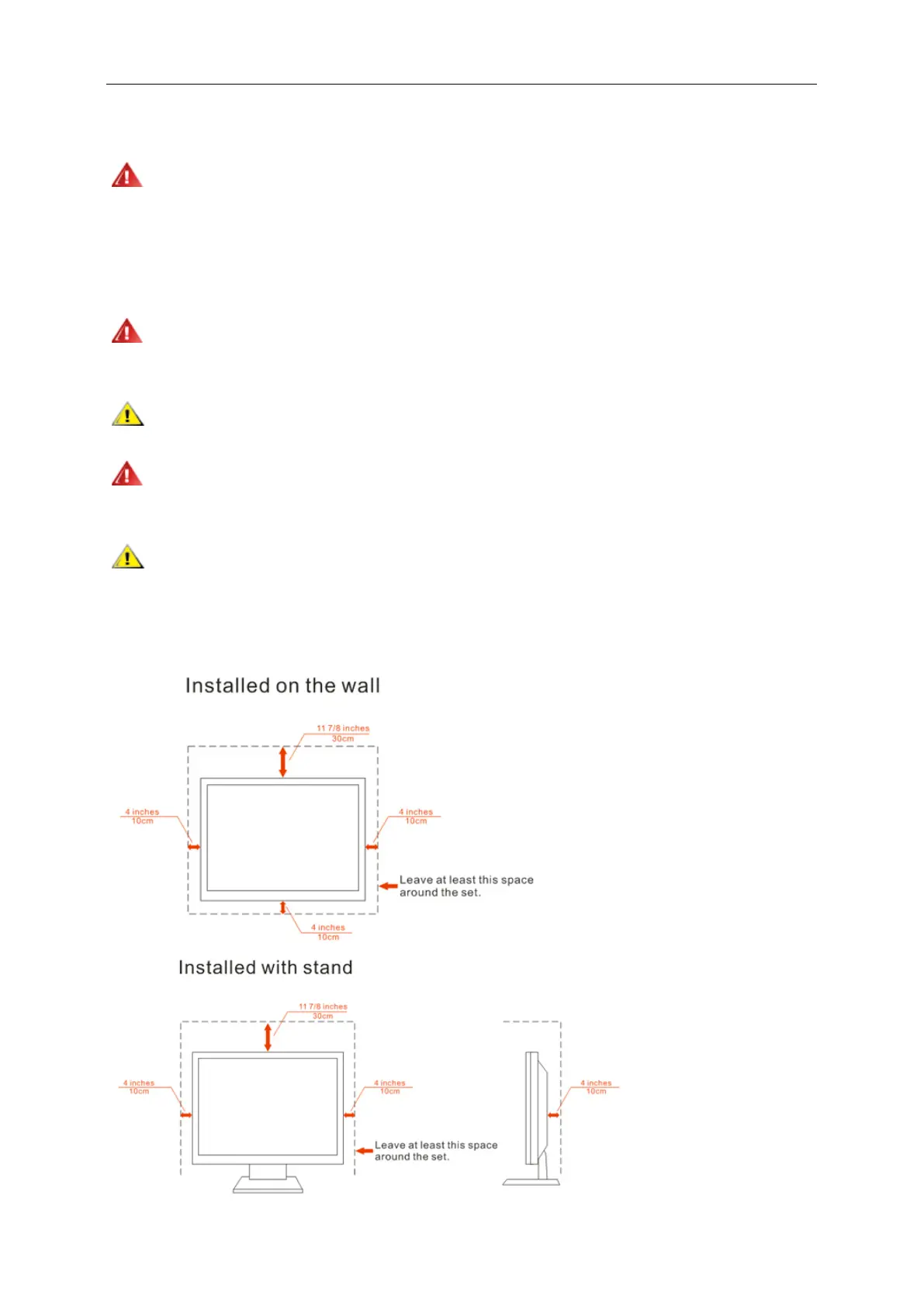 See below the recommended ventilation areas around the monitor when the monitor is installed on the wall or on