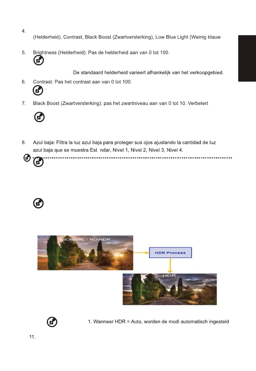 Helderheid en Contrast elk niveau van de "Blauw Licht"-waarde tonen.