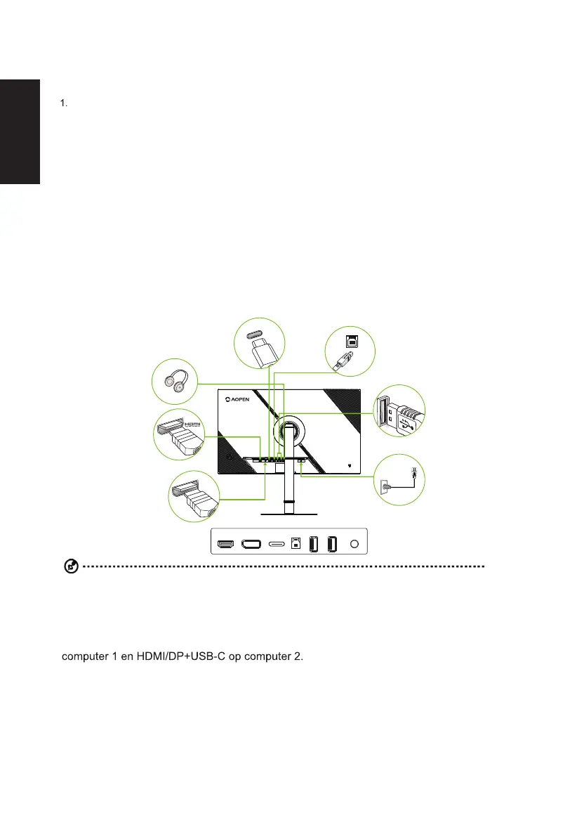 7. HDMI/DP+USB-B aansluiten op computer 1 en USB-C aansluiten op computer 2 wanneer u
