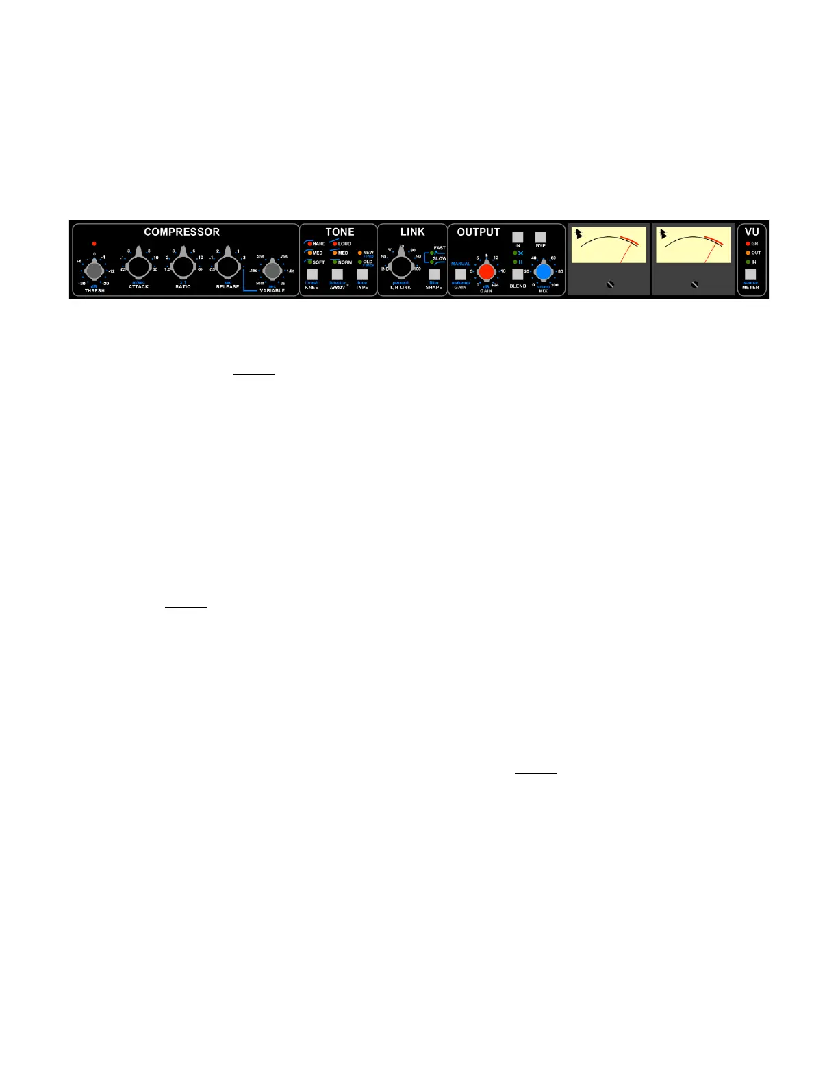 • Stereo VU meters show selectable input, output, or gain reduction levels