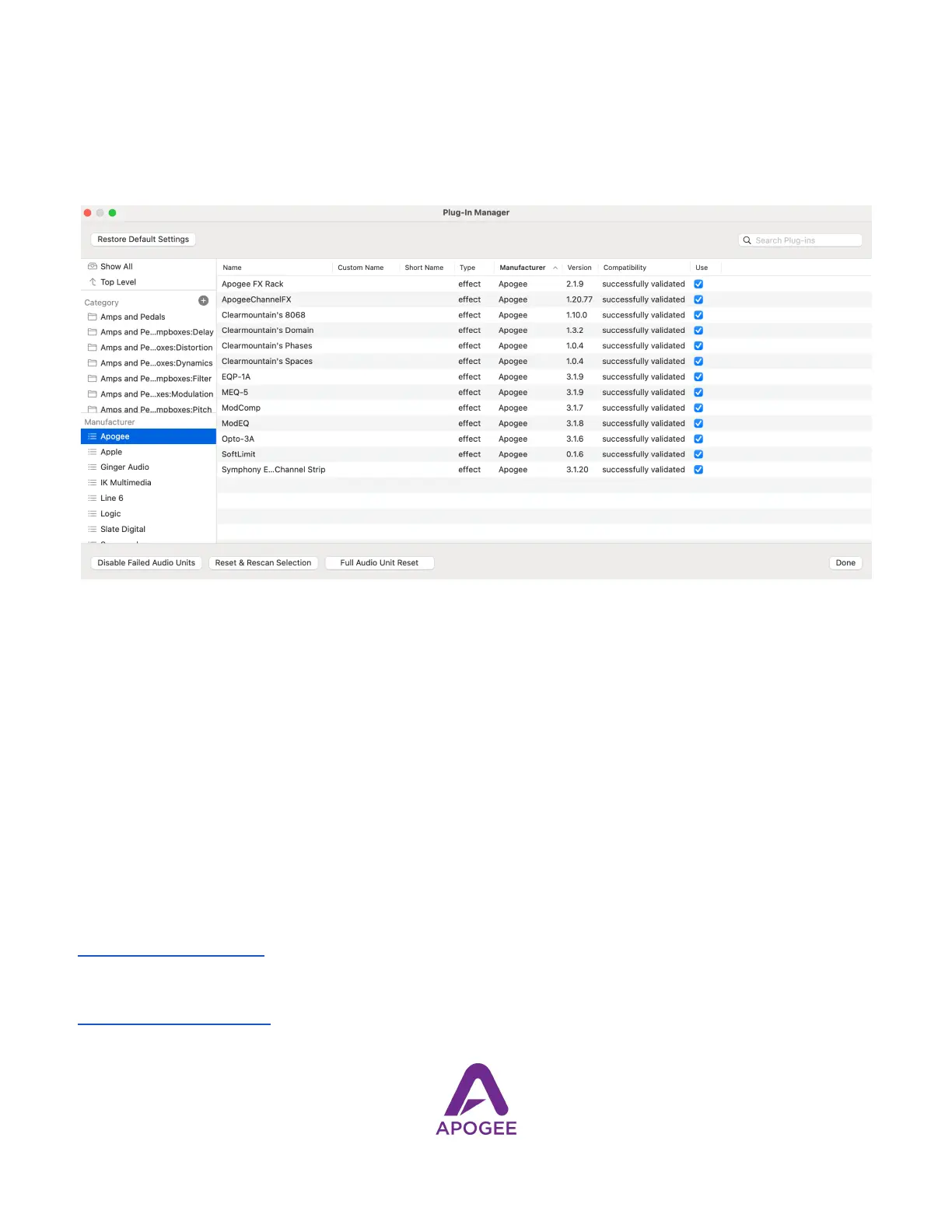 In the Plug-in Manager, click Apogee in the lefthand Manufacturer column, then verify that