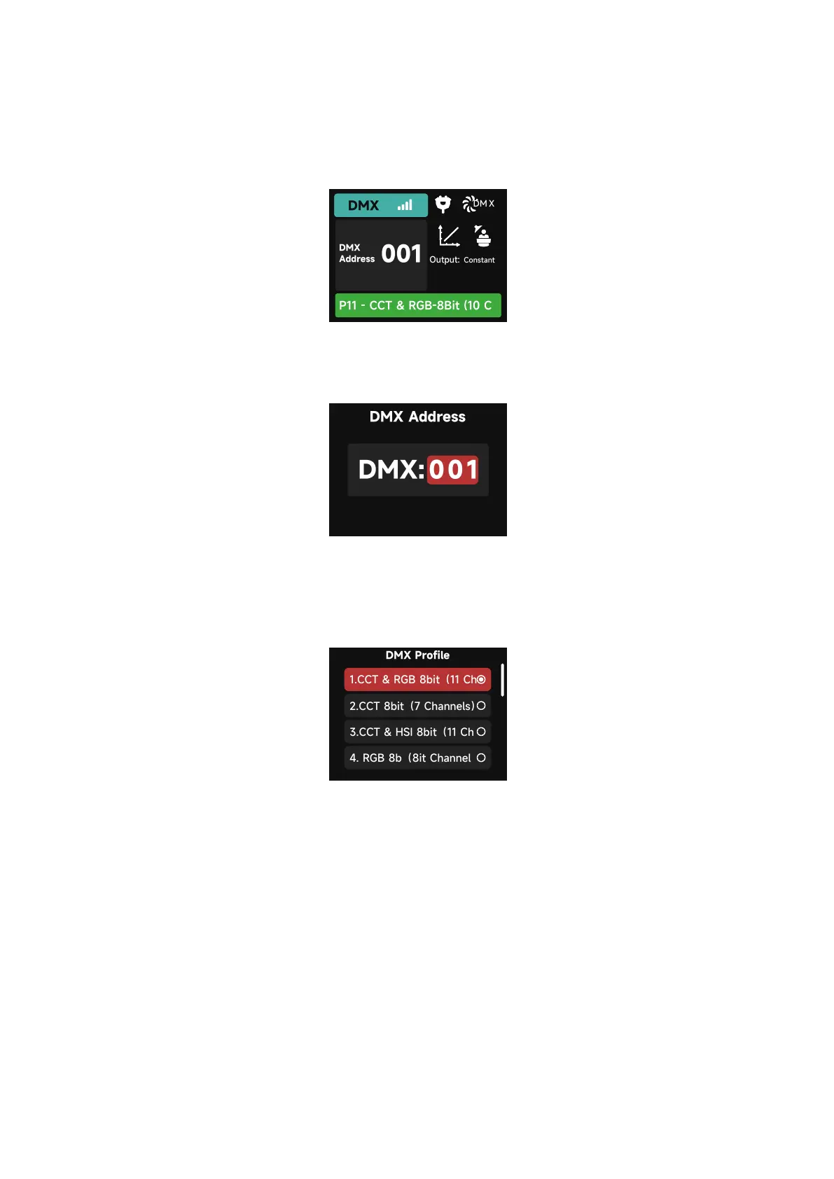 (1) DMX Status Screen: Displays DMX data status, the DMX address, the DMX Profile being