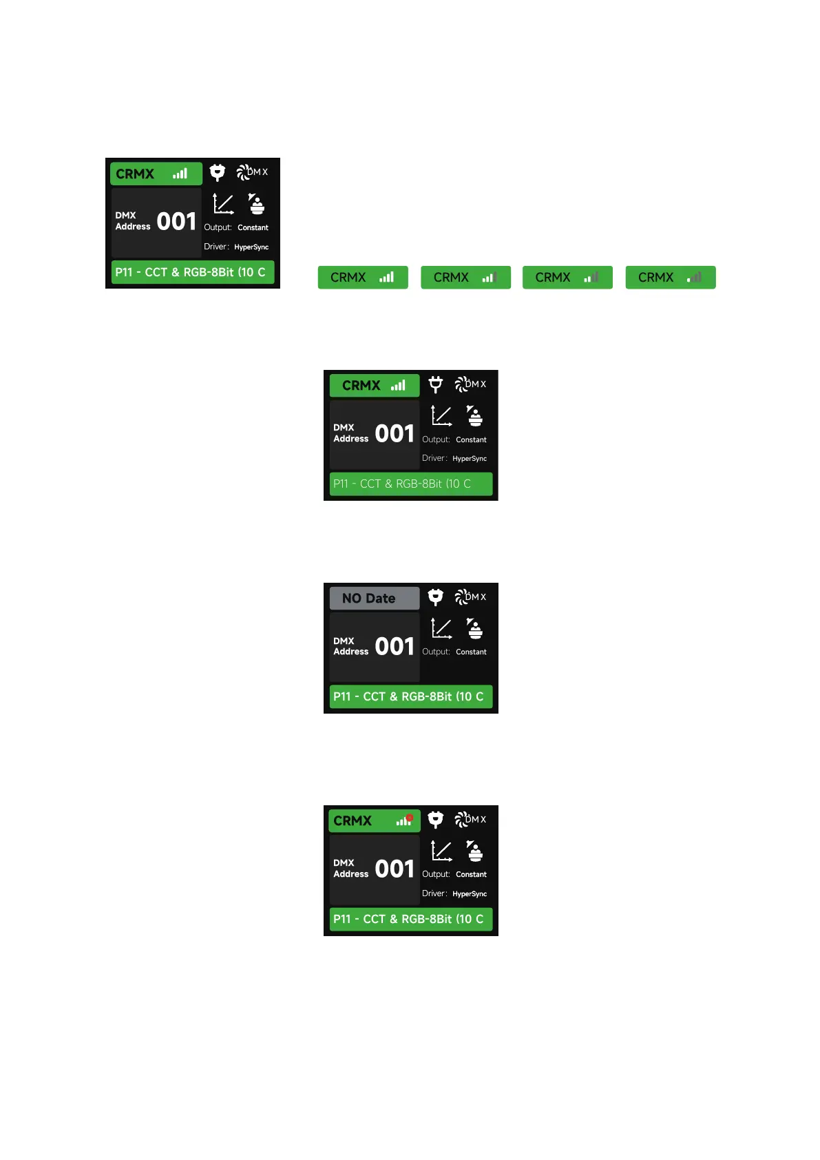 DMX Status Screen will indicate the CRMX signal strength the Control Box is receiving.