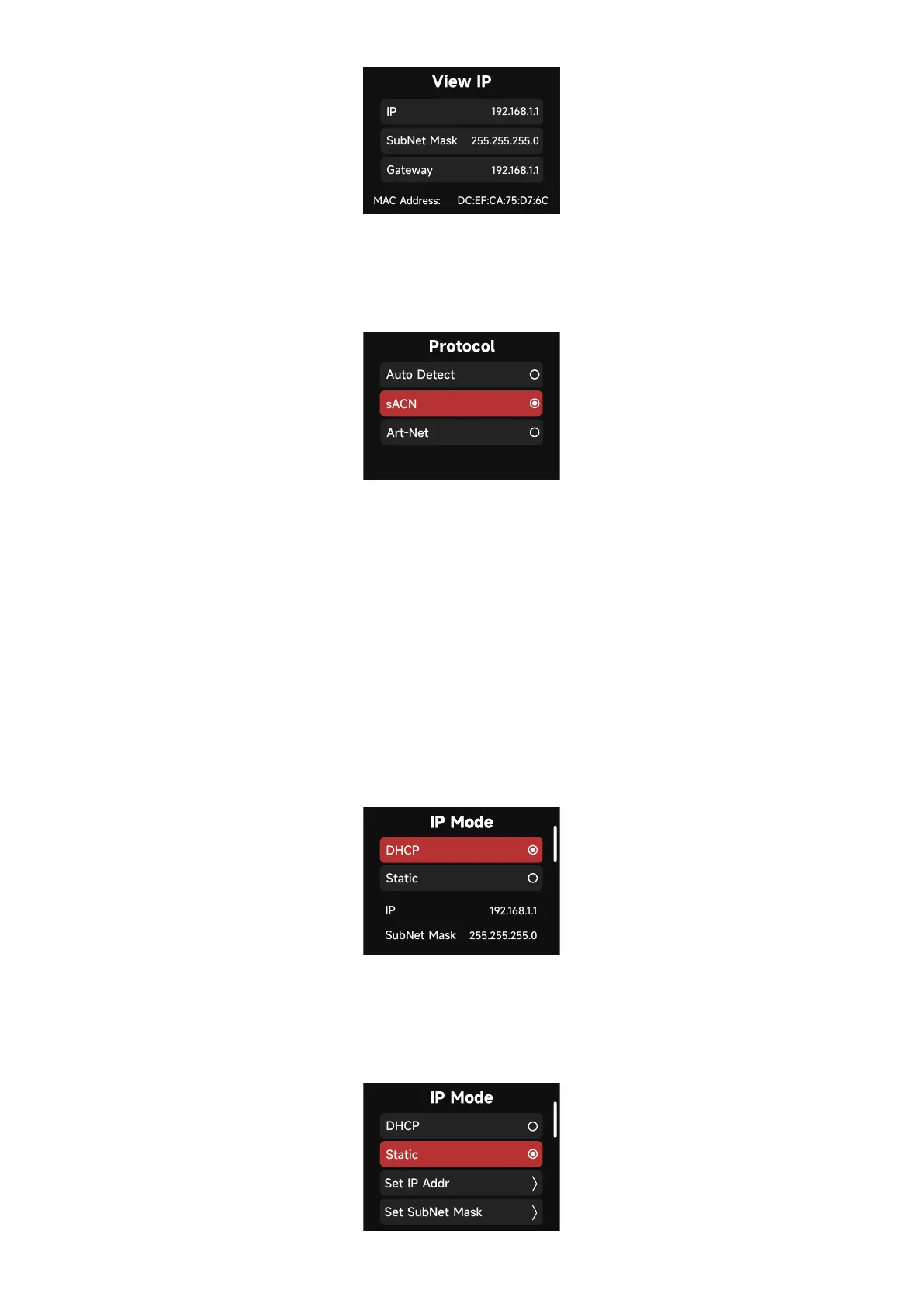 The fixture will automatically receive an IP address from the DHCP server. When in DHCP IP