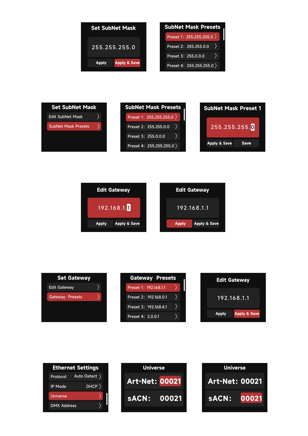 Set the Universe of Art-Net and sACN: Art-Net (00000-32767), sACN (00001-63999).