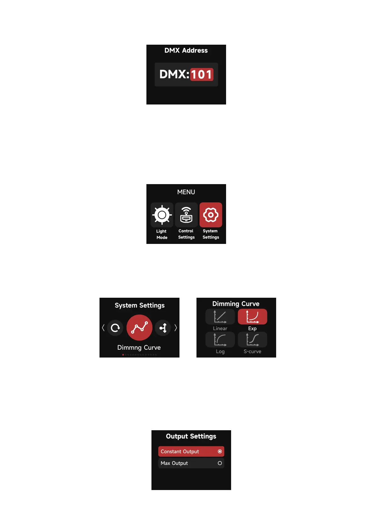 System Settings include: Dimming Curve, Output Settings, White Light Standard, Lead/Fol-