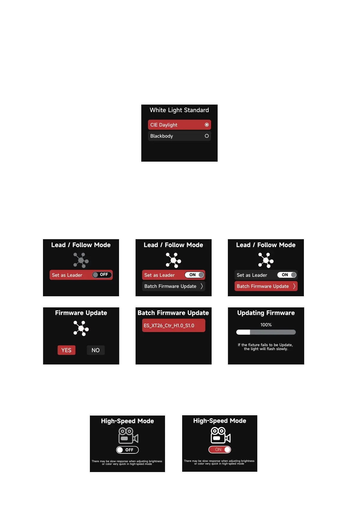 * The leader fixture should be connected with the followers via DMX to enable this function.