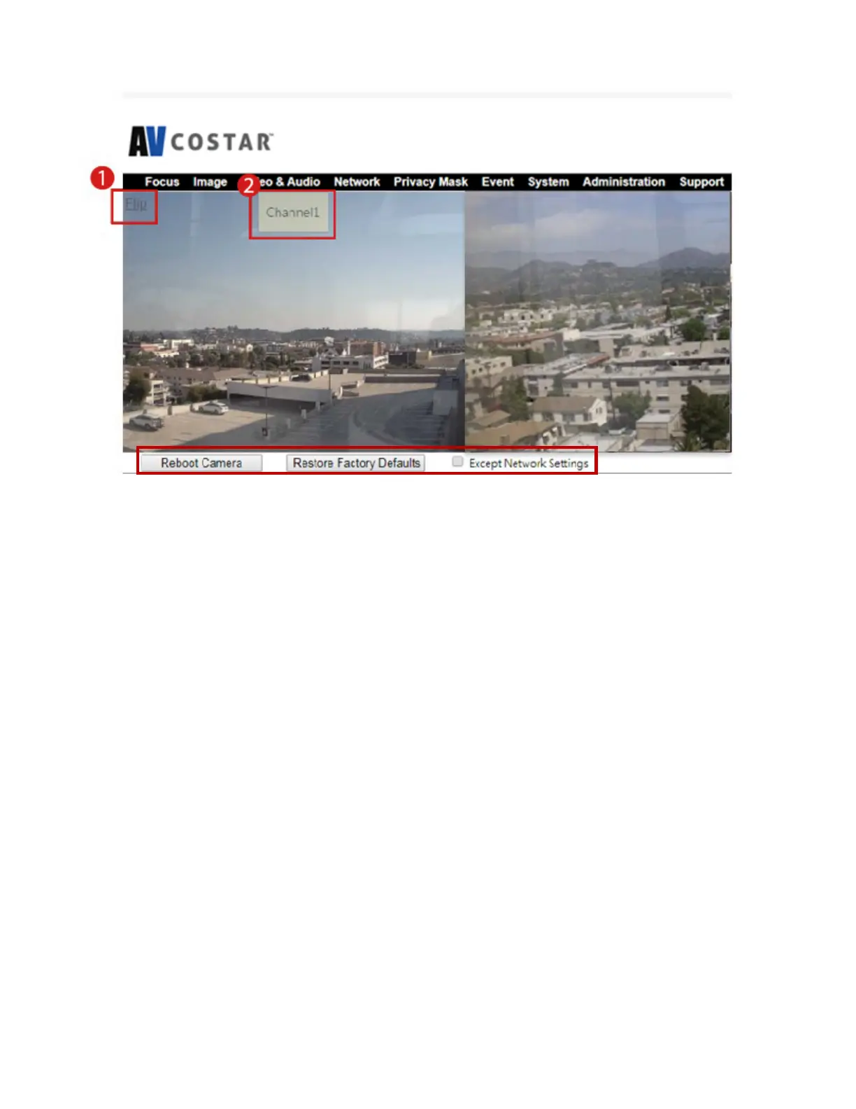 3. You will be able to reboot or restore the camera to factory default on Live View page.