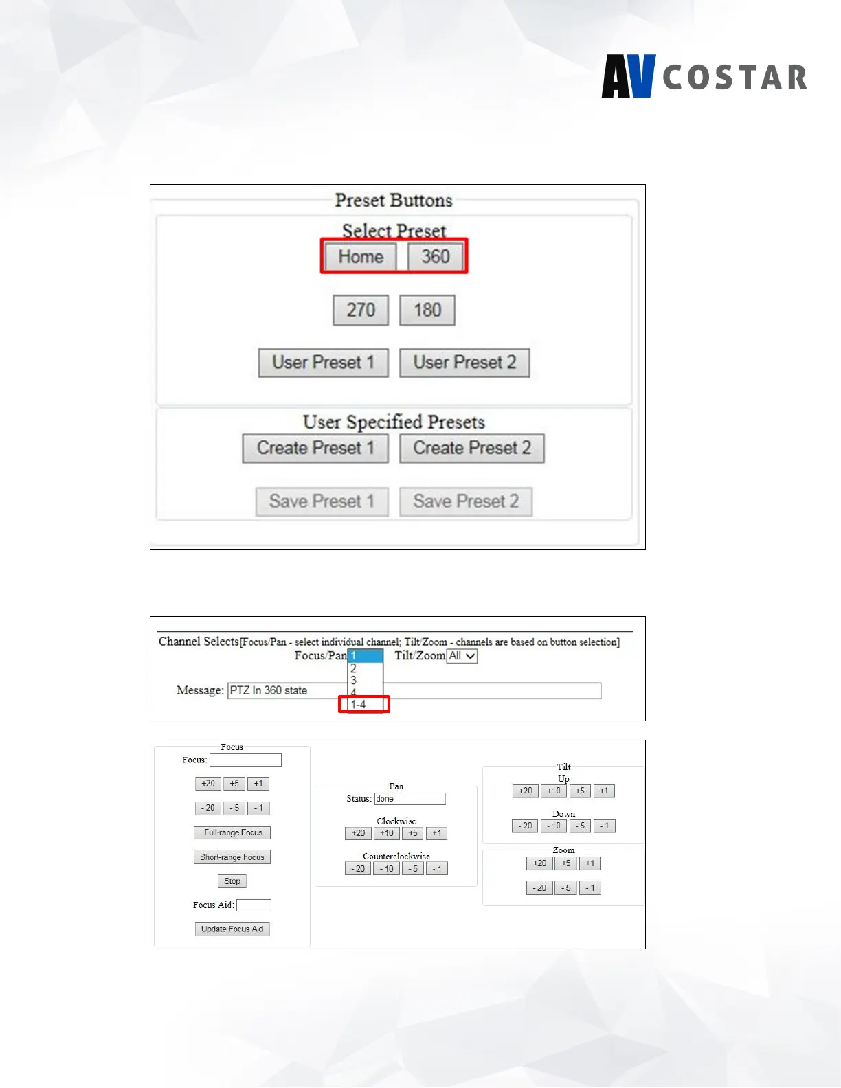 For individual adjustment on each camera module, select the “Focus/PTZ” tab.