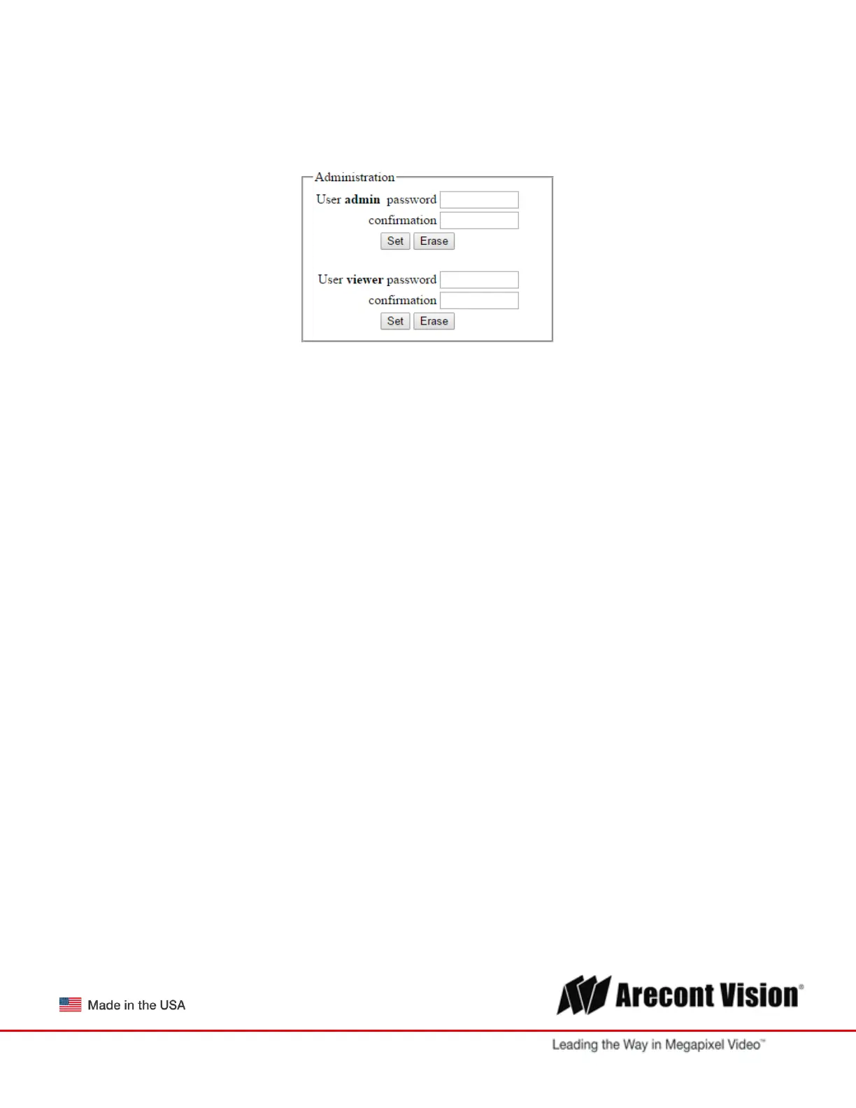 Administration is the place to set a password. Arecont Vision cameras support two levels of password-