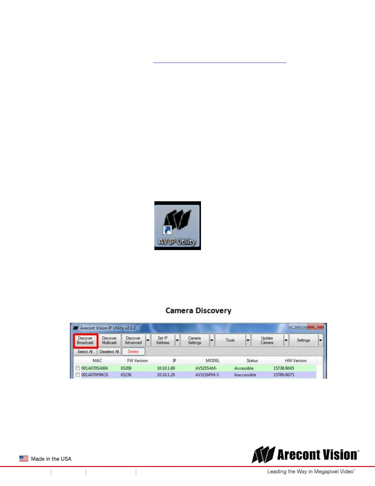 3. Click the Discovery Broadcast to display all Arecont Vision cameras on the network shown in