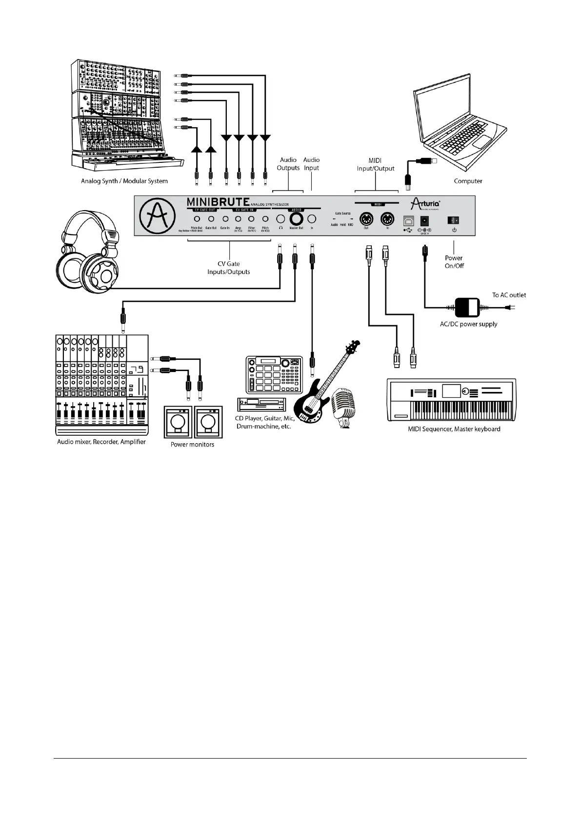 Here is an overview of the MiniBrute synthesizer’s connectors: